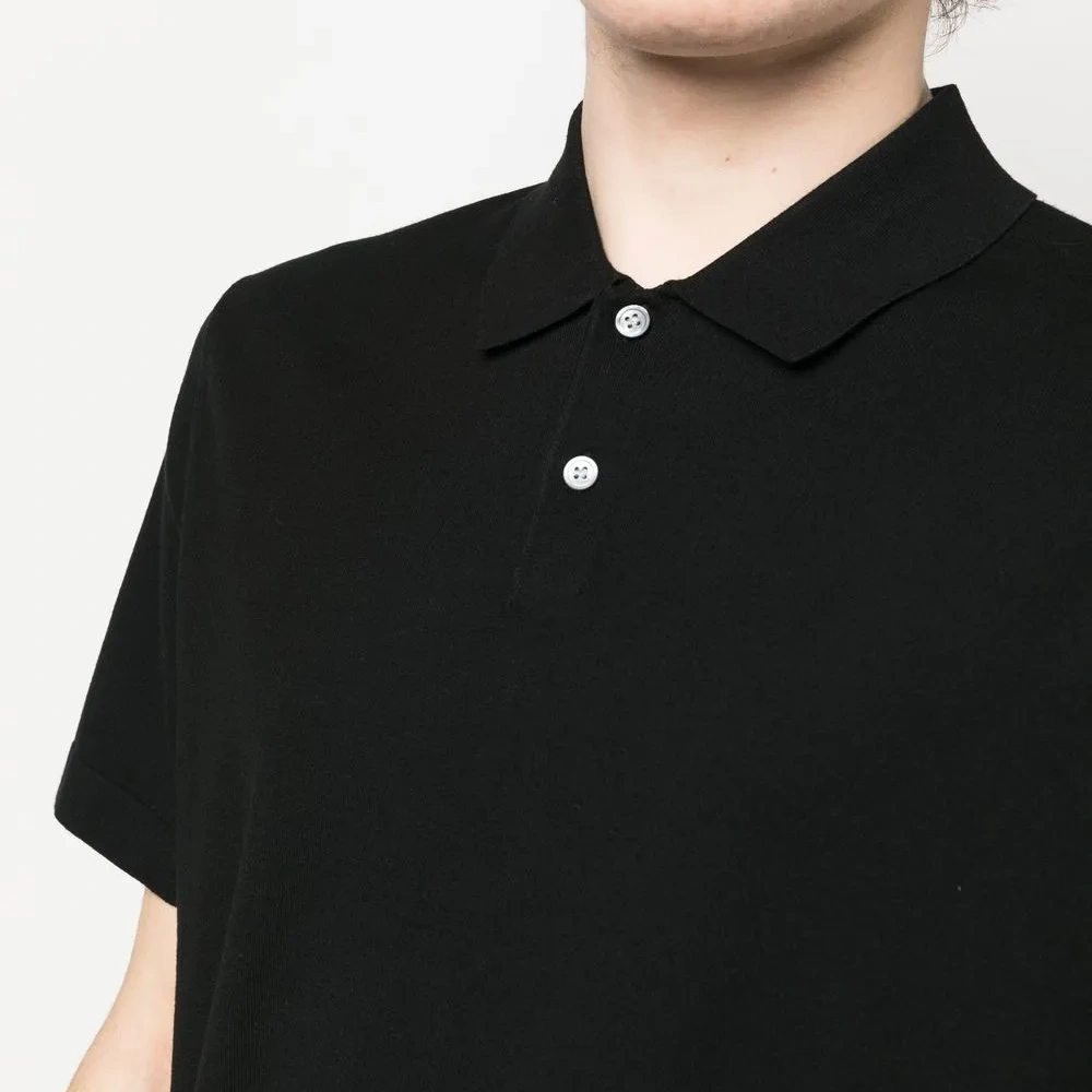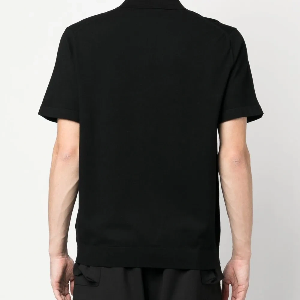 Черный, воротник поло, короткие рукава, подол в рубчик и прямой подол.