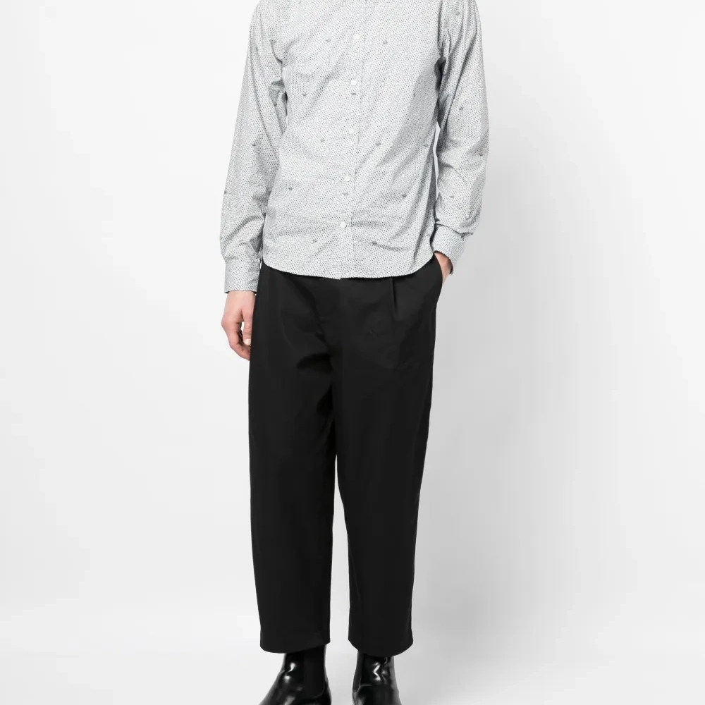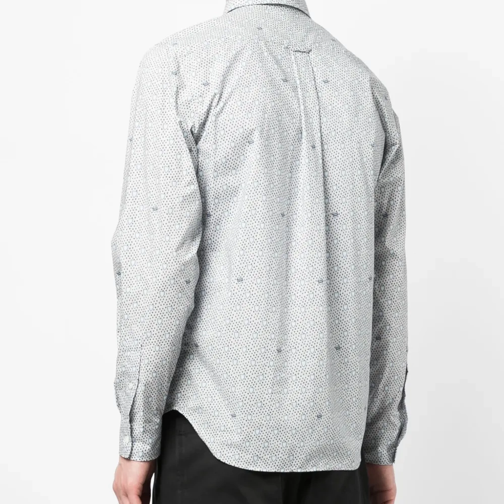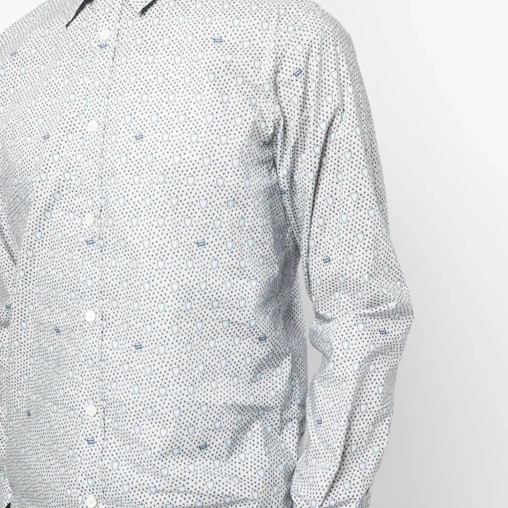 Расцветка Cloud White, темно-синий, хлопок, сплошной графичный принт, встречная складка, плоский заостренный воротник, застежка на пуговицах спереди, длинные рукава, манжеты на пуговицах и прямой подол.