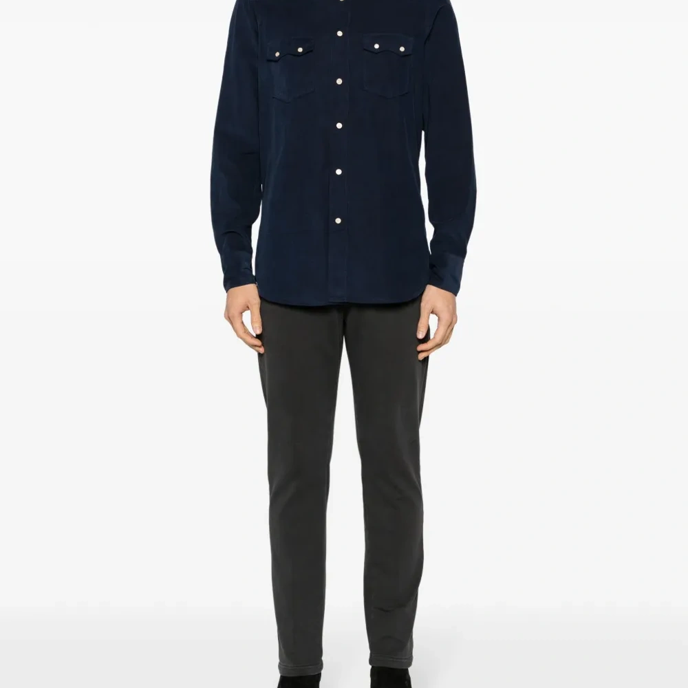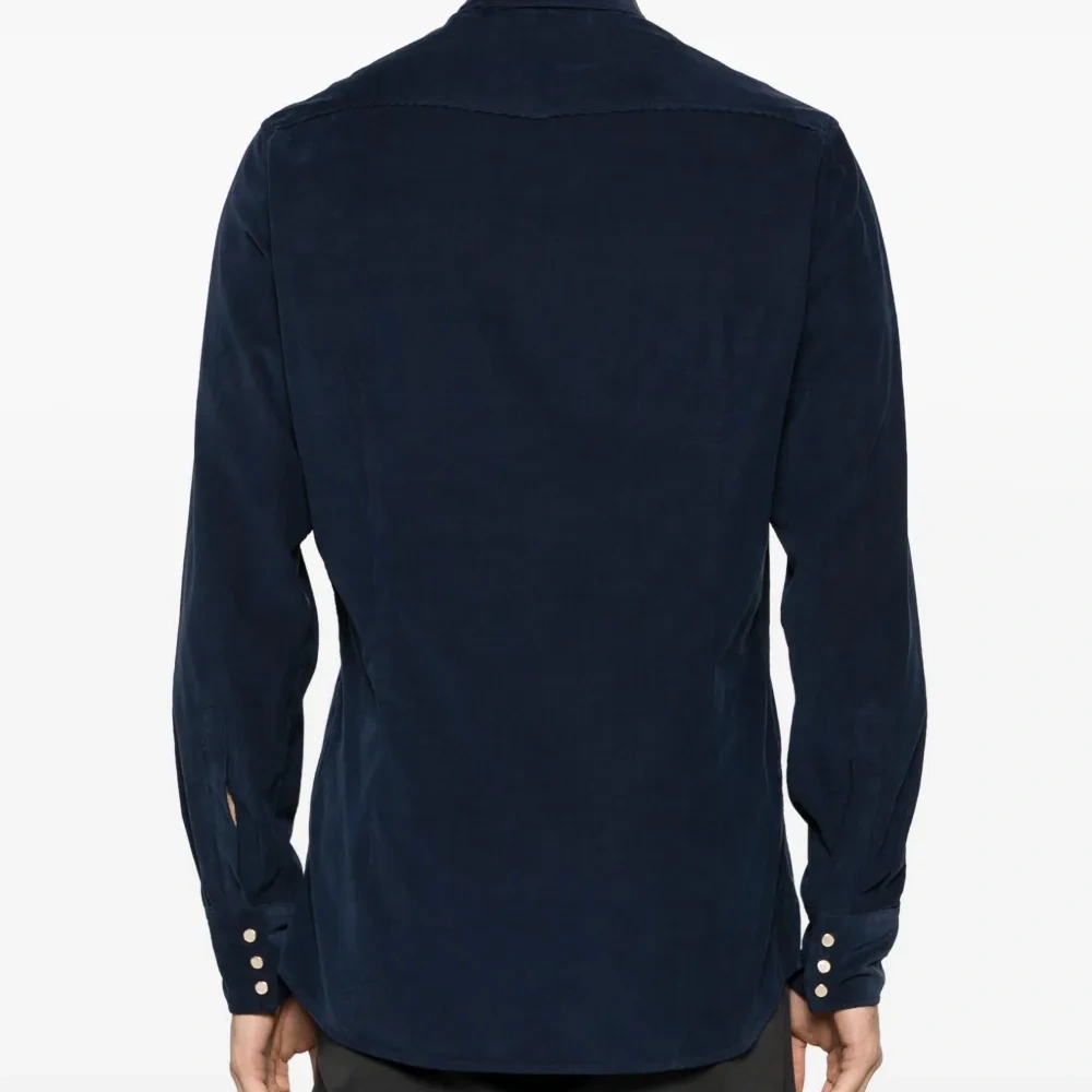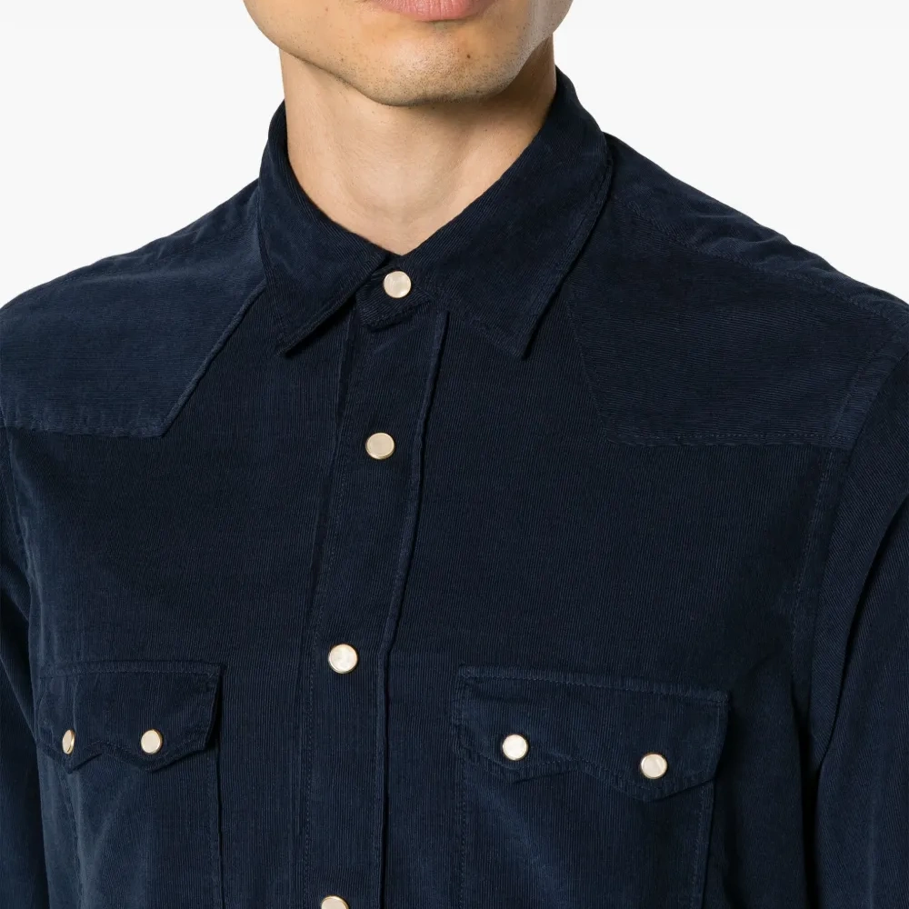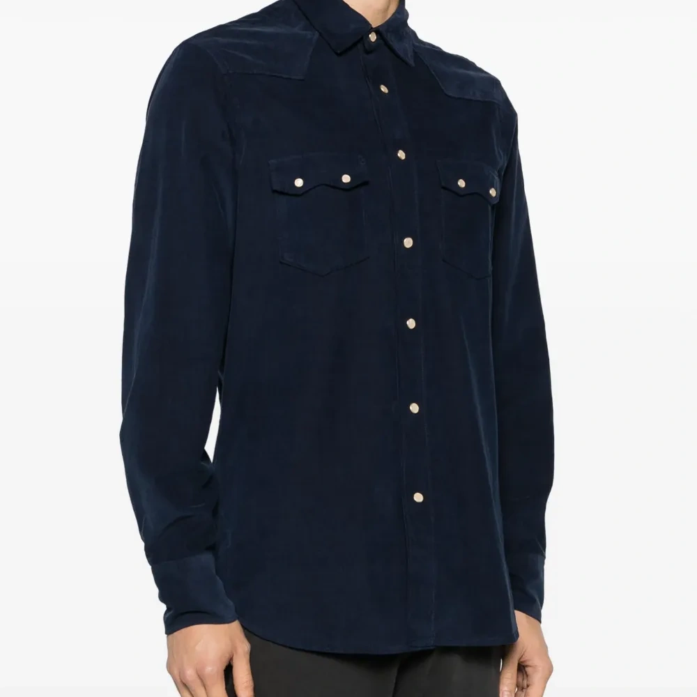 Темно-синий, хлопок, вельветовый материал, классический воротник, застежка на пуговицах спереди, длинные рукава, манжеты с застежкой на кнопки, два боковых кармана с застежкой на кнопки и закругленный подол.