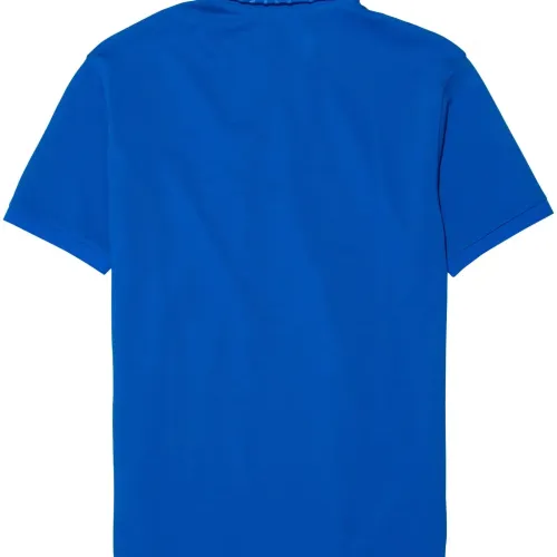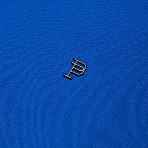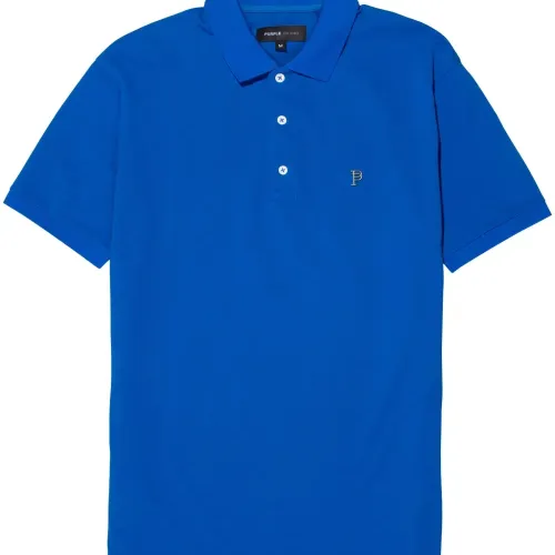 Синий, хлопок, ткань пике, металлический логотип, воротник поло, планка на пуговицах спереди, короткие рукава и прямой подол.