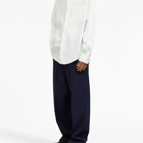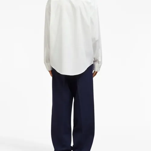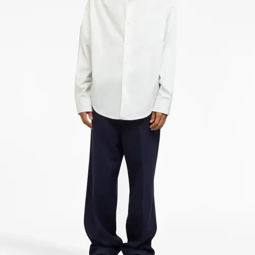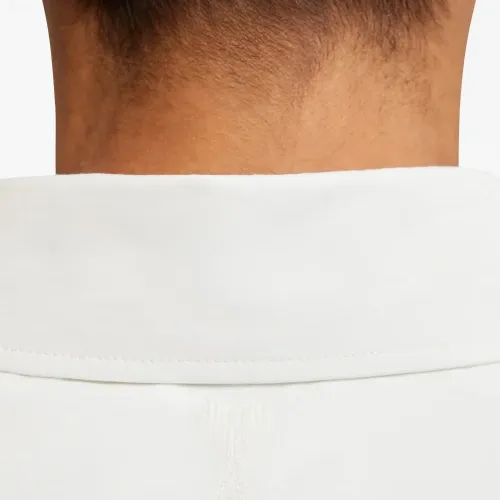 Белый, хлопок, нагрудный накладной карман, длинные рукава и застежка на пуговицах спереди. Это унисекс-модель. Обратите внимание, что для нее используется мужская размерная сетка.