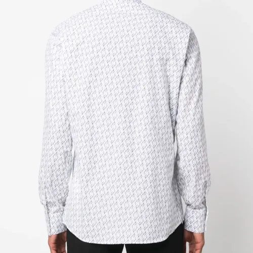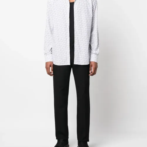 Белый/черный, хлопок, текстовый принт, классический воротник, застежка на пуговицах спереди, длинные рукава, манжеты на пуговицах и закругленный подол.