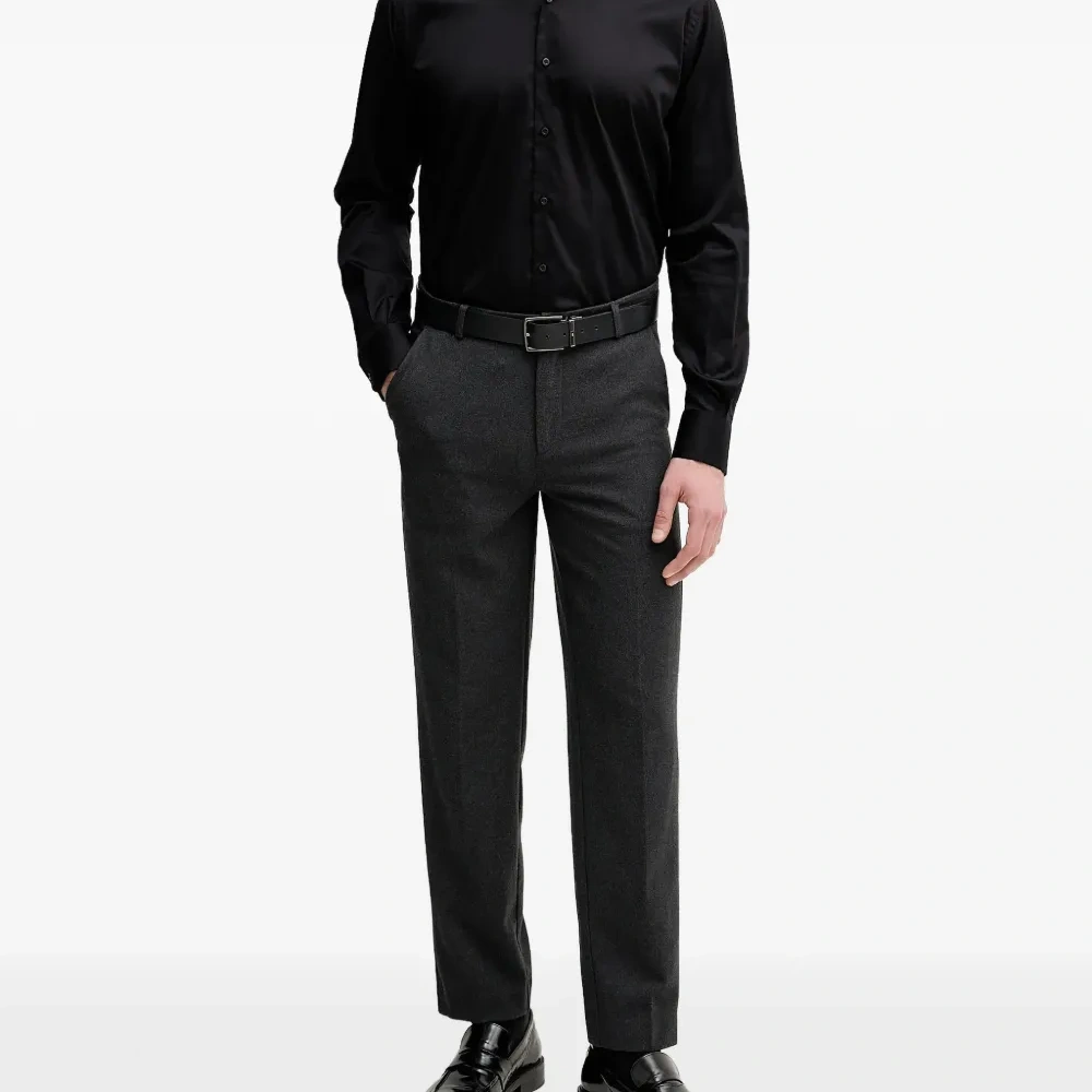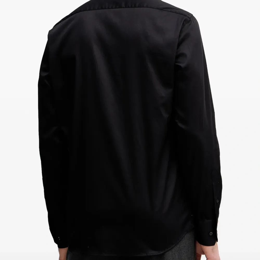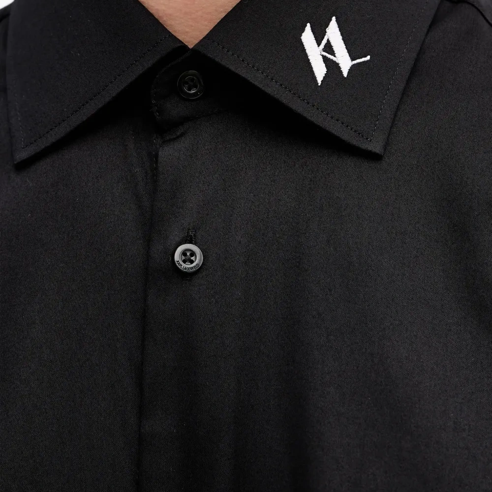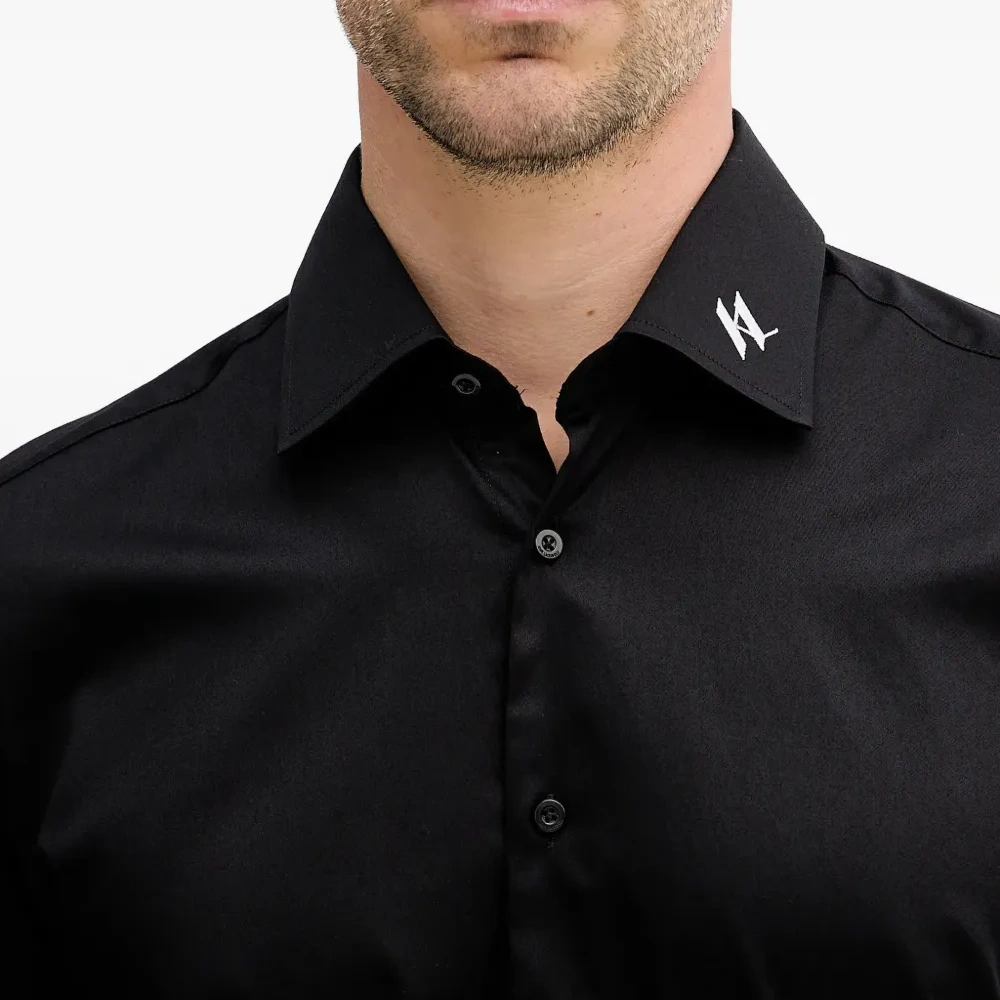 черная рубашка с вышитым логотипом, застежкой на пуговицы, длинными рукавами, манжетами на пуговицах и классическим воротником