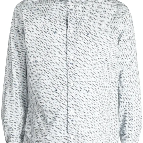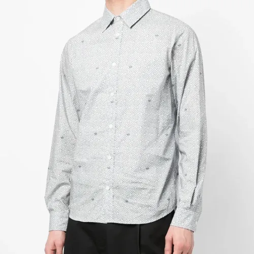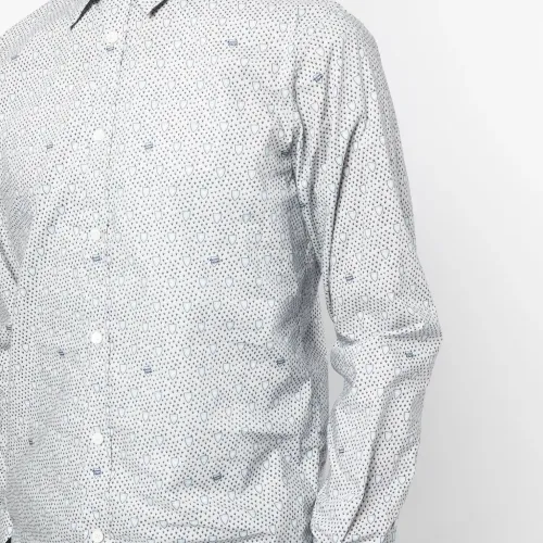 Расцветка Cloud White, темно-синий, хлопок, сплошной графичный принт, встречная складка, плоский заостренный воротник, застежка на пуговицах спереди, длинные рукава, манжеты на пуговицах и прямой подол.