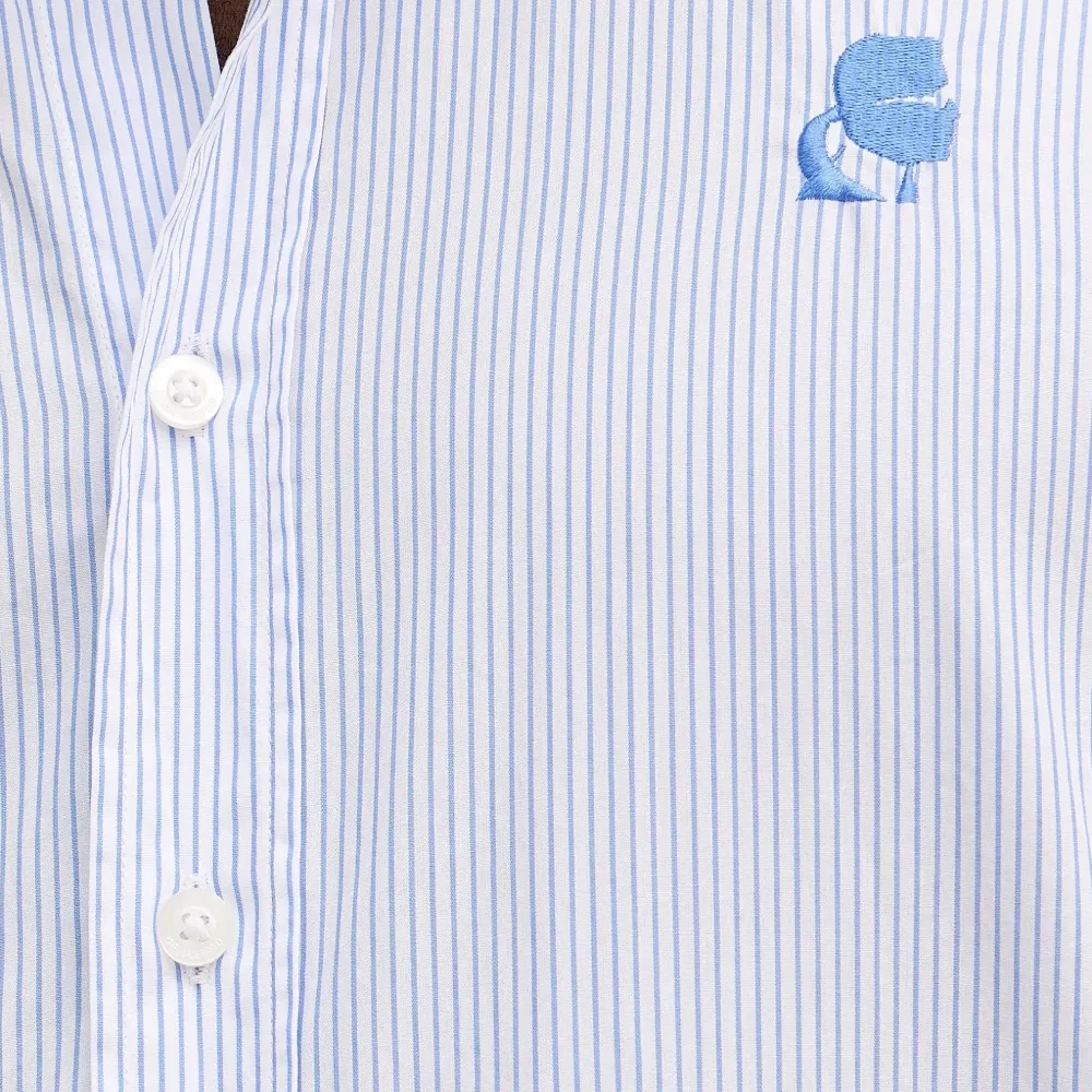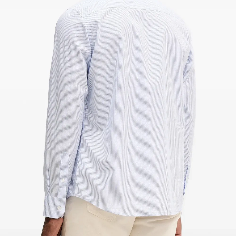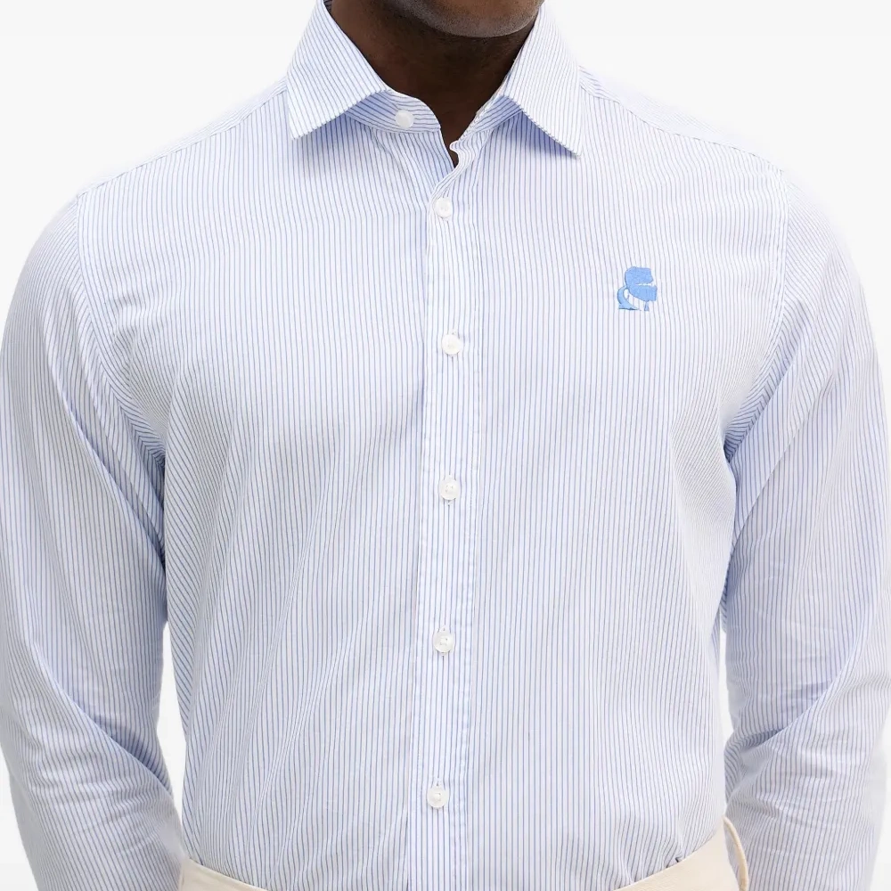 светло-голубая и белая рубашка в полоску с логотипом, застежкой на пуговицы, длинными рукавами и манжетами на пуговицах