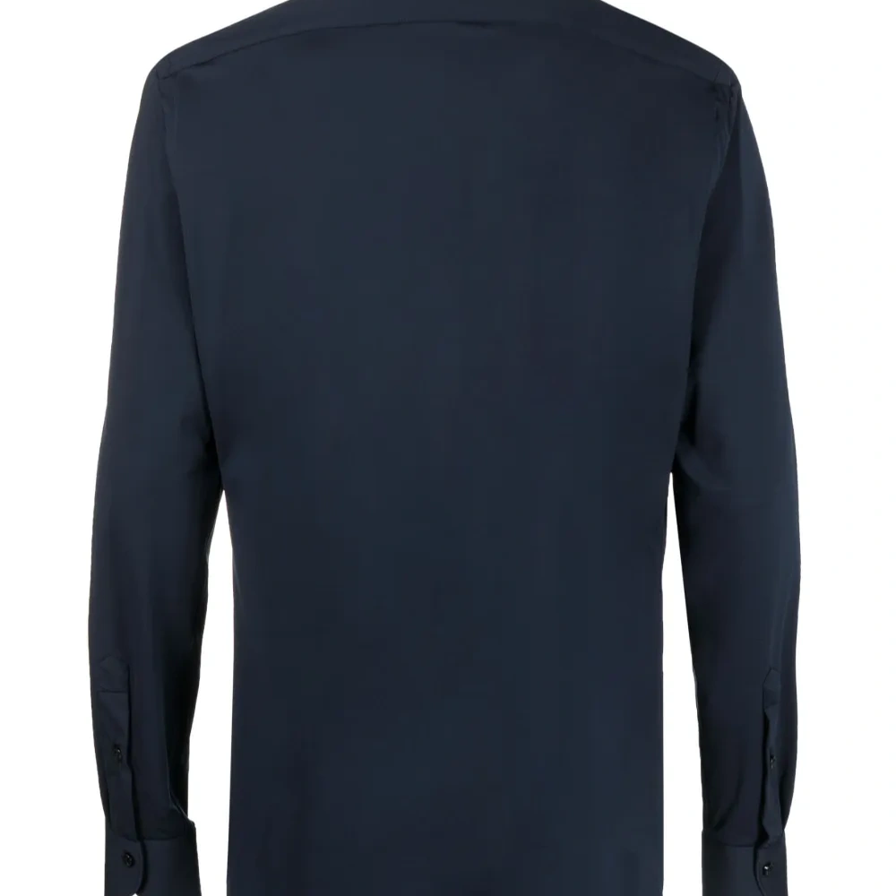 Темно-синий, стрейчевая ткань, отложной воротник, застежка на пуговицах спереди, длинные рукава, манжеты на пуговицах и закругленный подол.
