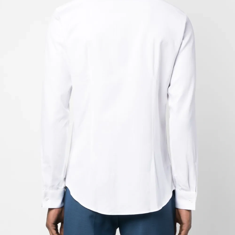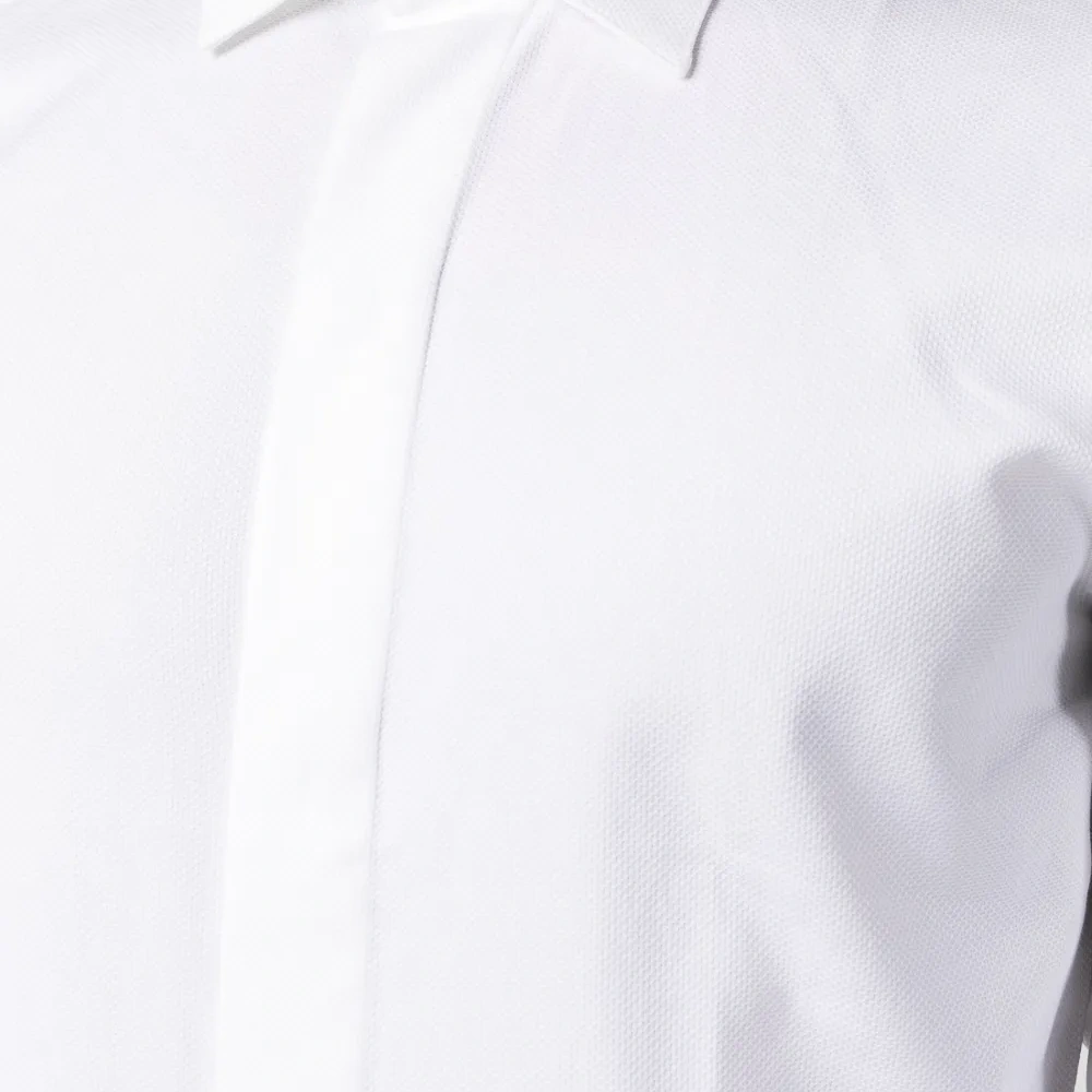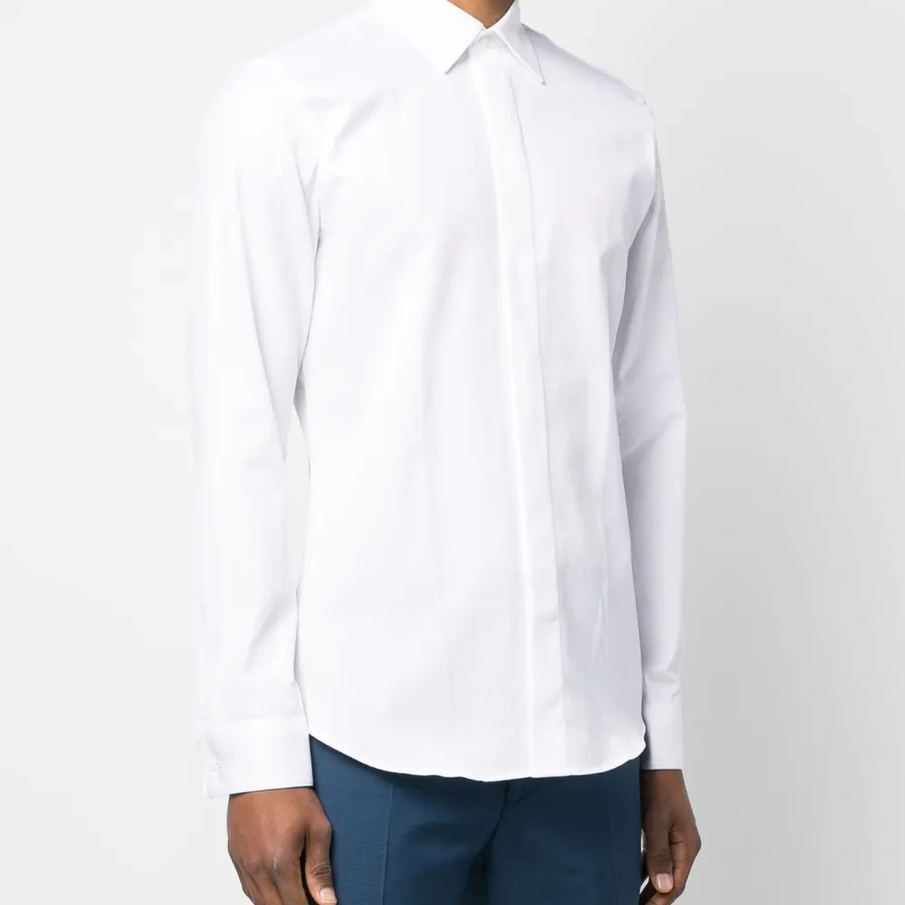 Молочно-белый, хлопок, классический воротник, потайная пуговичная застежка спереди, длинные рукава, рукава с манжетами на пуговицах и прямой подол.