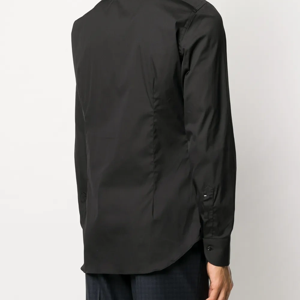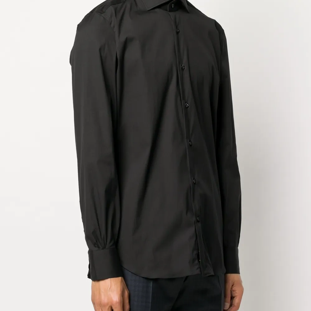 Рубашка узкого кроя на пуговицах от Mazzarelli. Косой воротник, застежка на пуговицах спереди, длинные рукава, манжеты на пуговицах и закругленный подол.