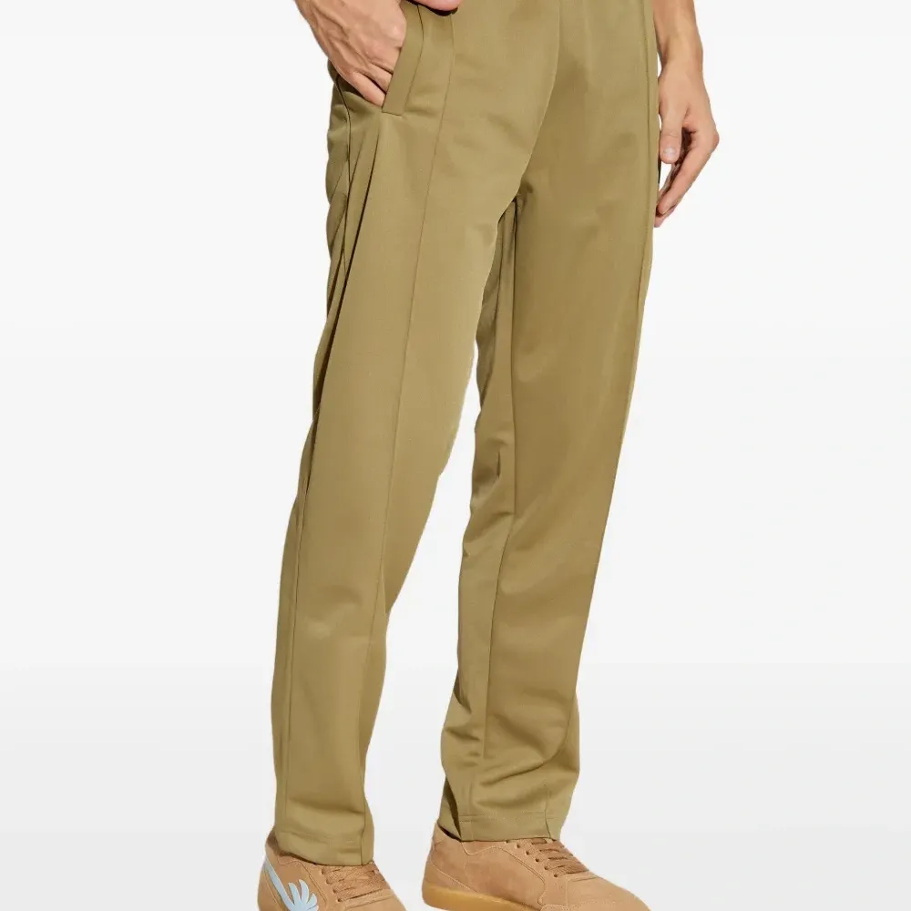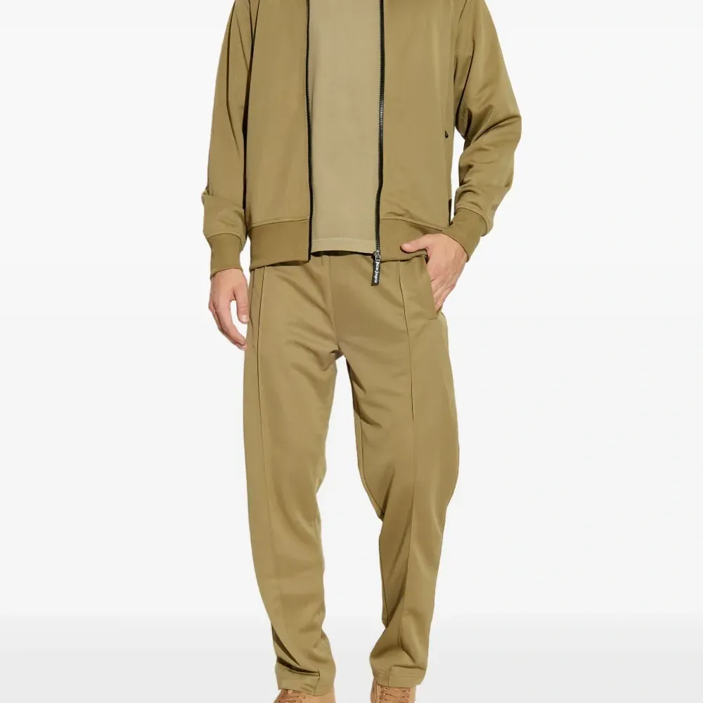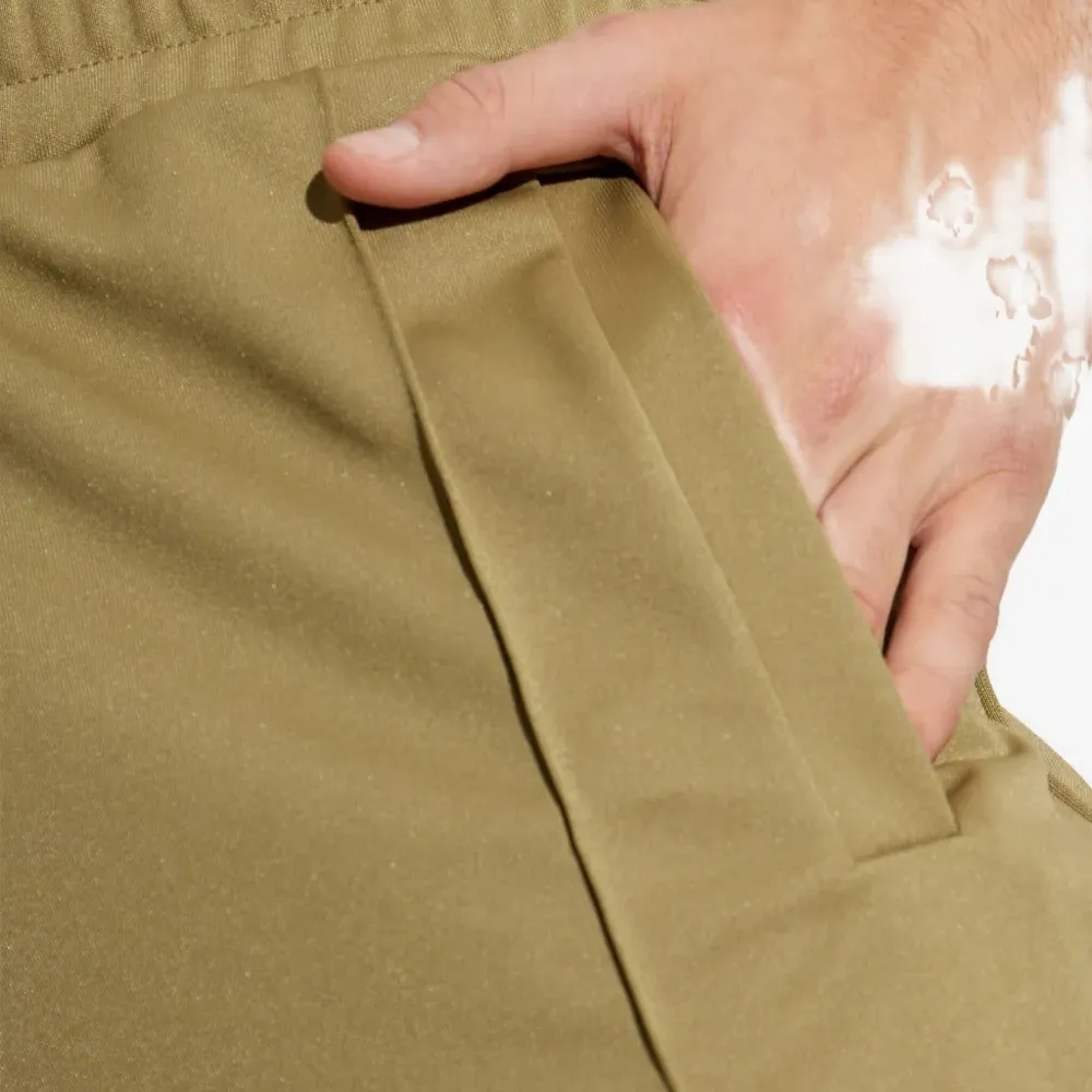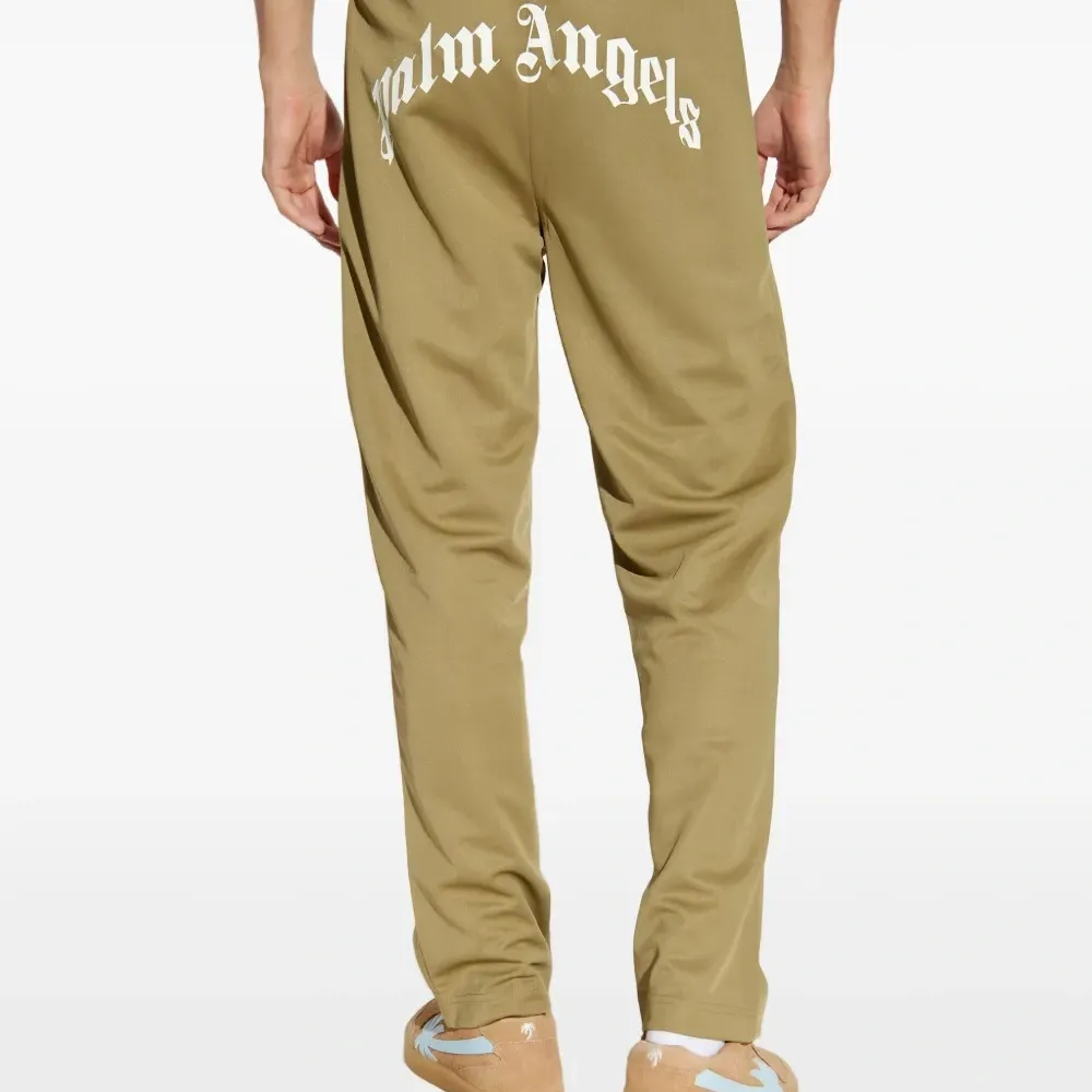 оливково-зеленый цвет, эластичный пояс, принт с логотипом сзади, прорезные карманы по бокам
