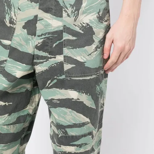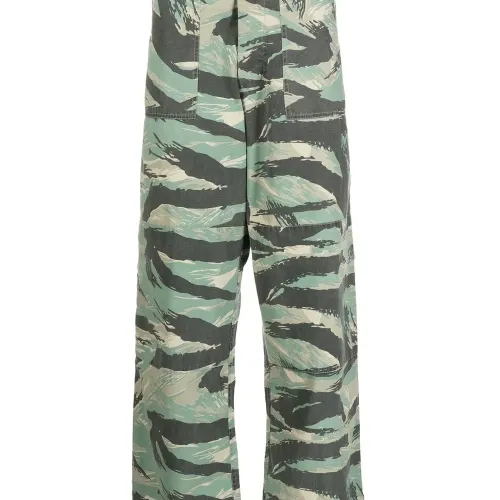 Зеленый, хлопок, камуфляжный принт, петли для ремня, застежка на молнии и пуговице спереди, два прорезных кармана по бокам, два кармана с клапанами сзади и прямой крой.