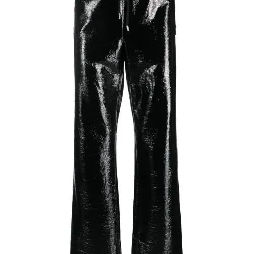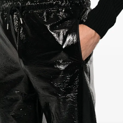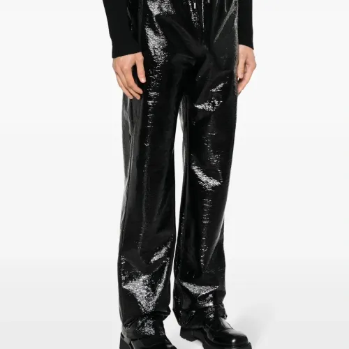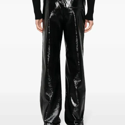 Черный, глянцевая фактура, кулиска на талии, средняя посадка, прямой крой, два вшитых кармана по бокам и карман на молнии сзади.