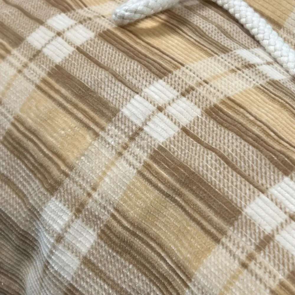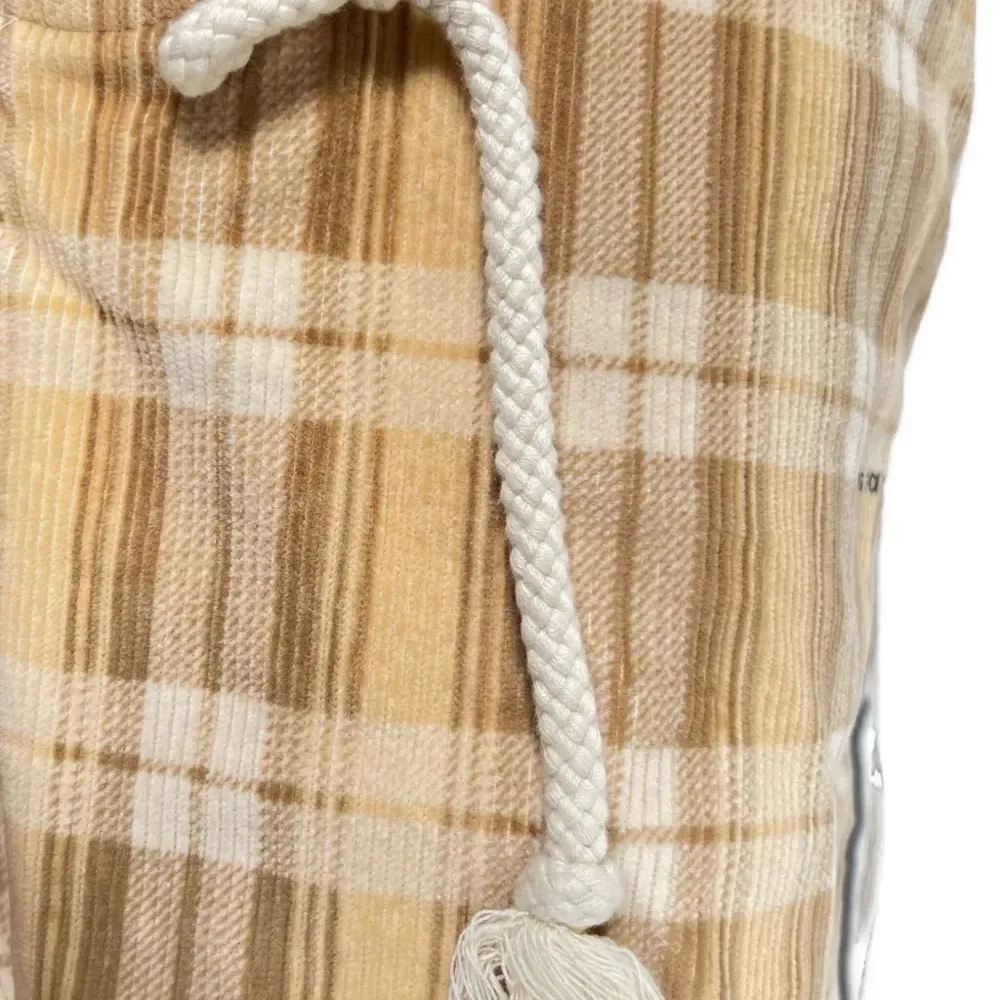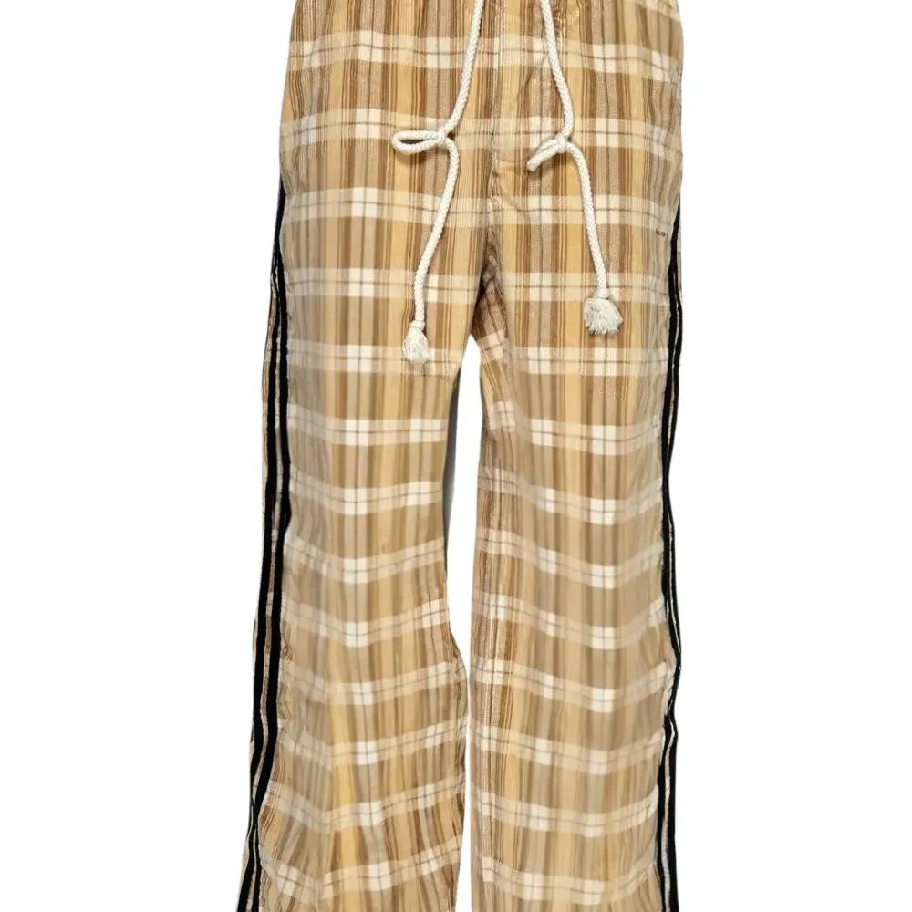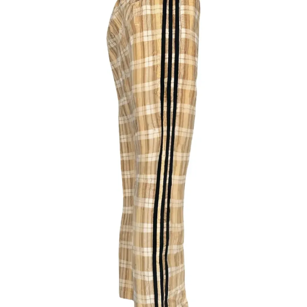 бежевые брюки в клетку с завязкой на шнурке, полоской по бокам и эластичным поясом