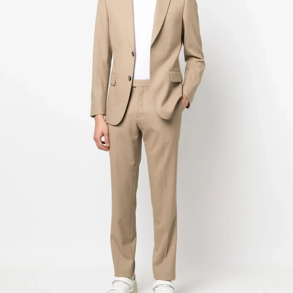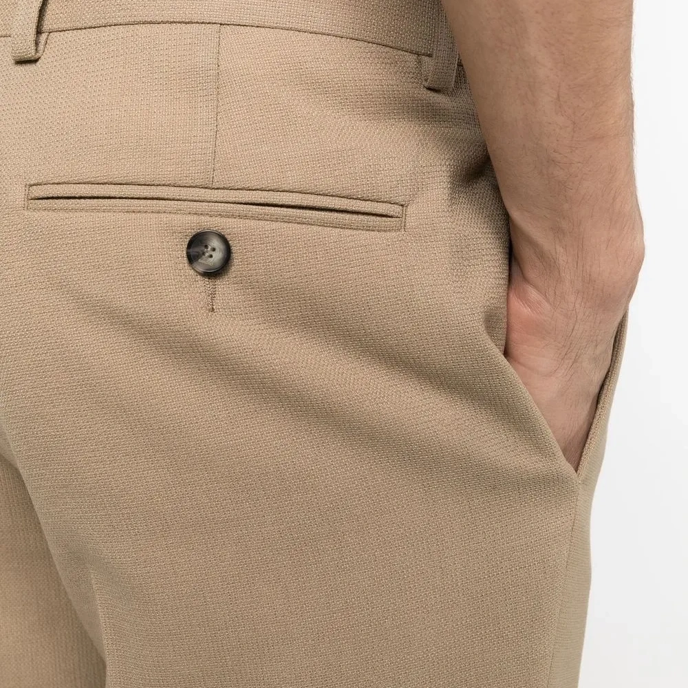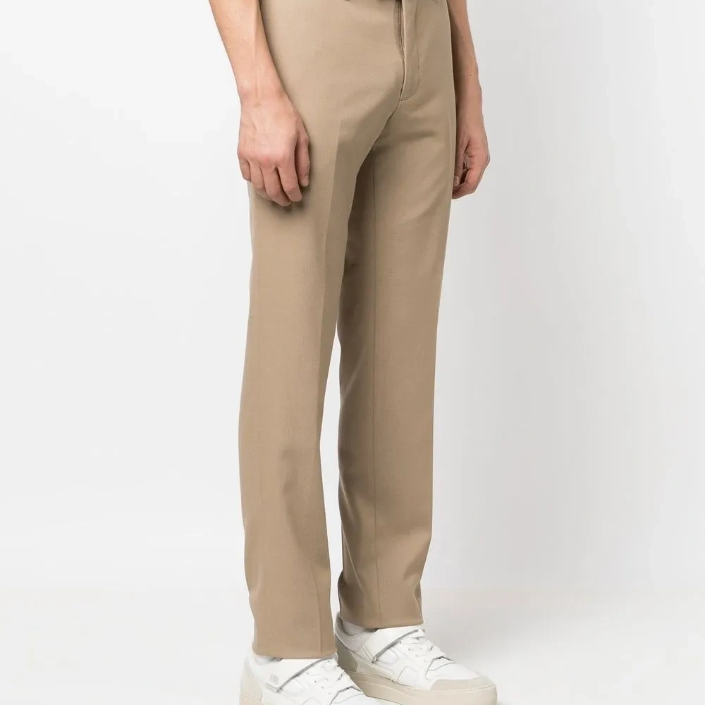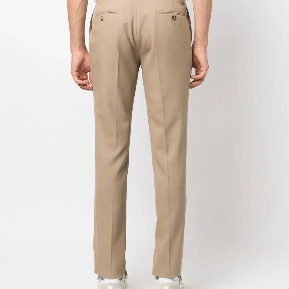 Бежевый, эластичная шерсть, средняя посадка, застежка на крючке спереди, петли для ремня, два кармана с листочкой сзади и зауженный крой.
