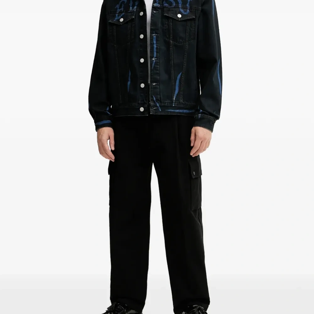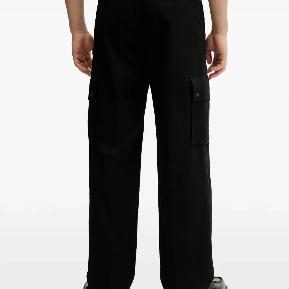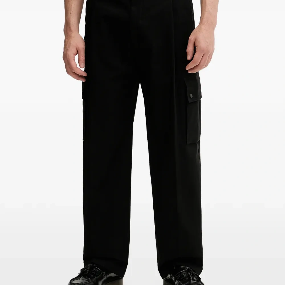чёрные карманы карго, шлёвки для ремня, застёжка на пуговицу, тональная строчка