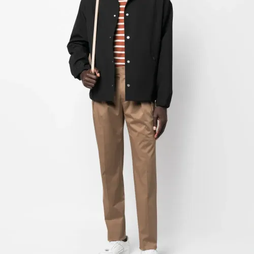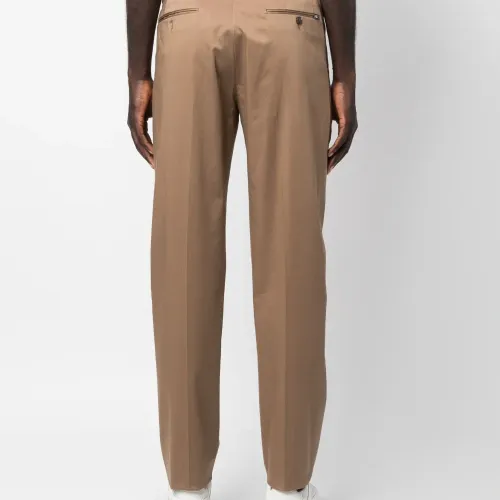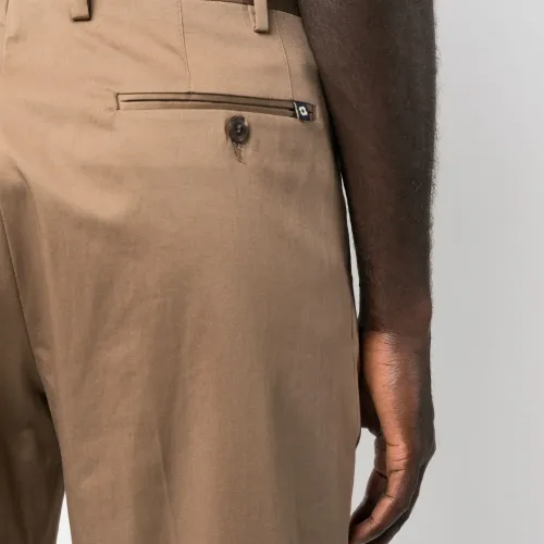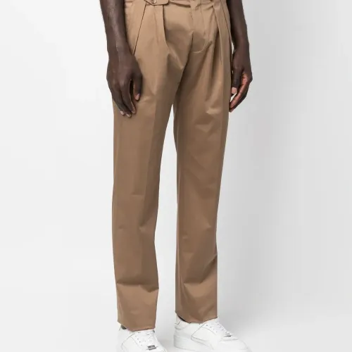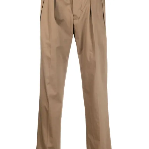 Нежно-коричневый, эластичный хлопок, складки, петли для ремня, застежка на молнии и пуговице спереди, прорезные карманы по бокам, два прорезных кармана на пуговицах сзади и прямой крой.