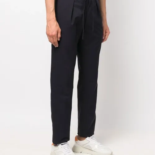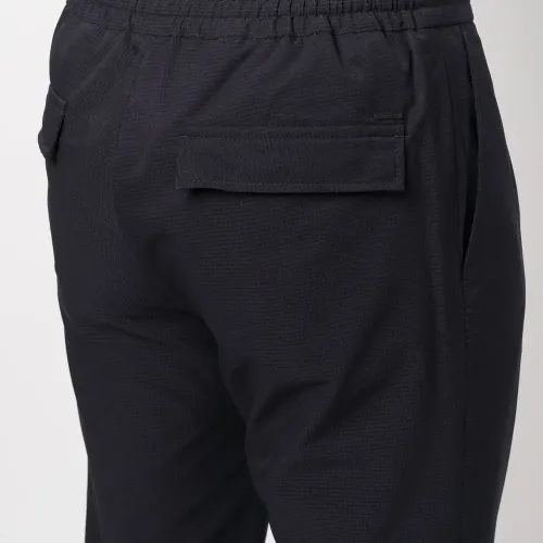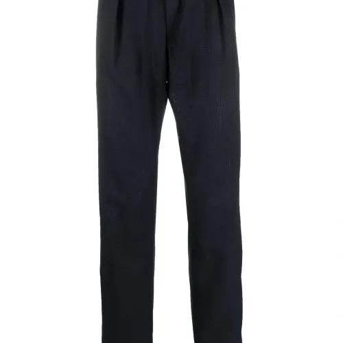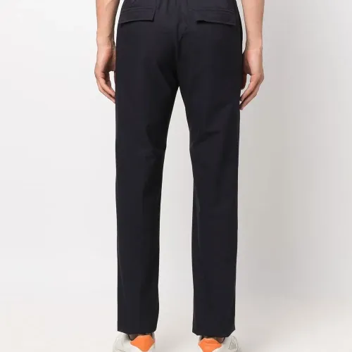 Темно-синий, потайная застежка спереди, эластичный пояс, два кармана с клапанами сзади и зауженный крой.