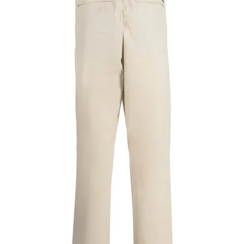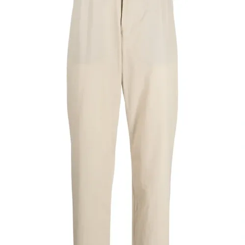 Кремово-белый, петли для ремня, кулиска на талии, потайная пуговичная застежка спереди, два кармана с листочкой сзади и прямой крой.