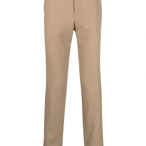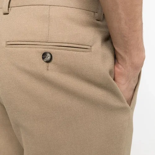 Бежевый, эластичная шерсть, средняя посадка, застежка на крючке спереди, петли для ремня, два кармана с листочкой сзади и зауженный крой.