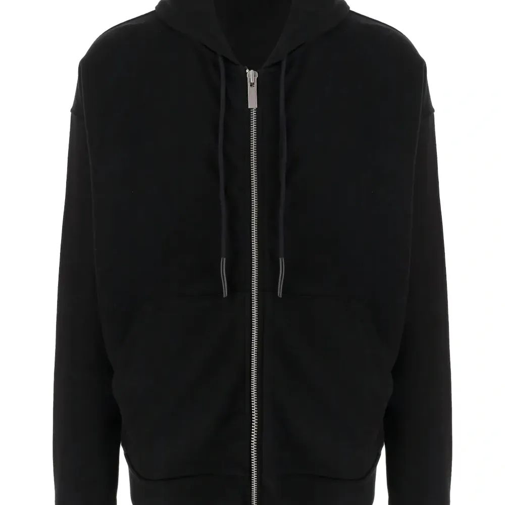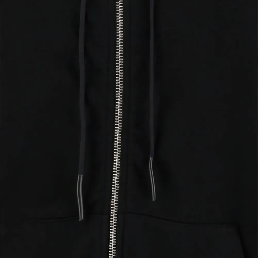 черный цвет, капюшон со шнурком, застежка-молния спереди, принт с логотипом, длинные рукава, прямой подол