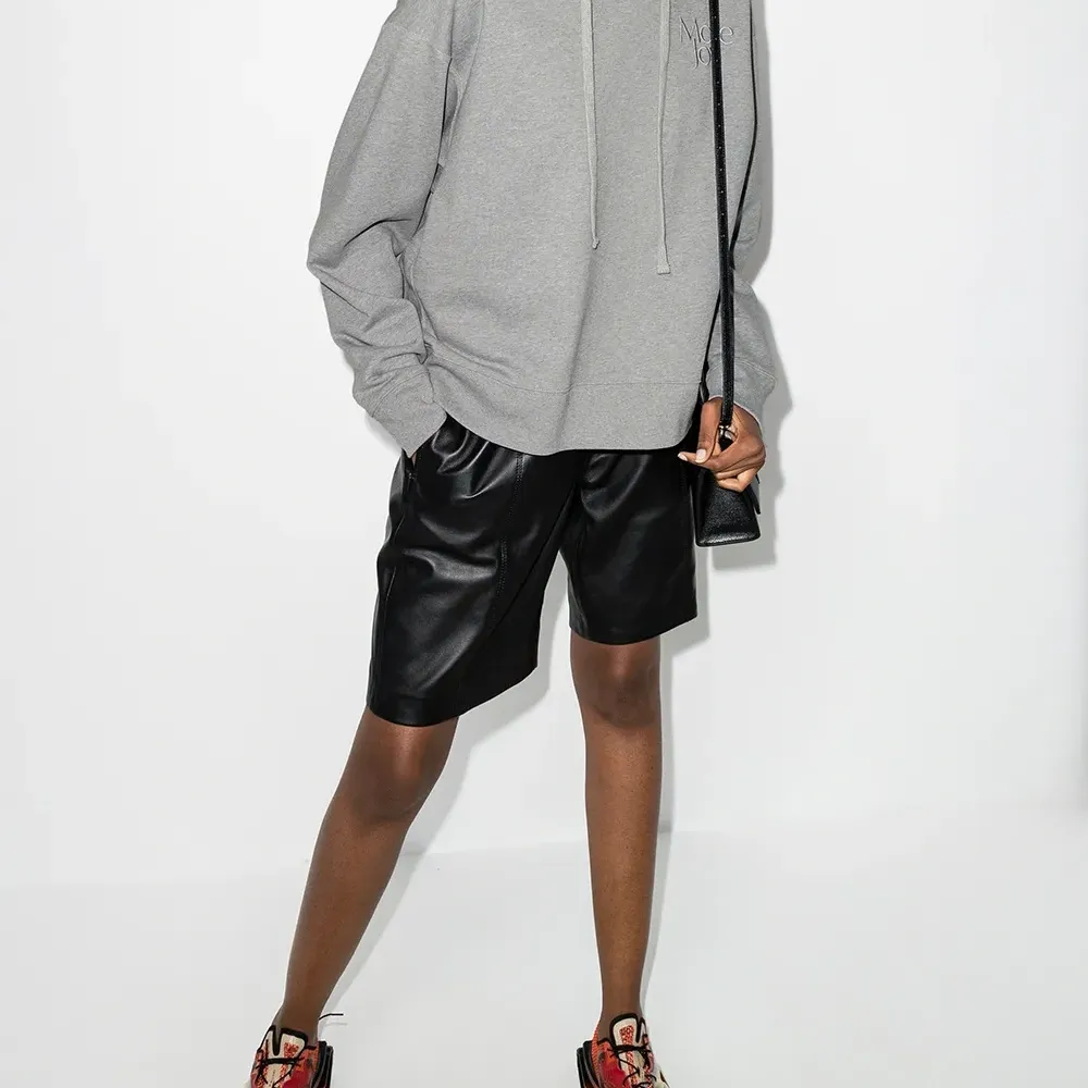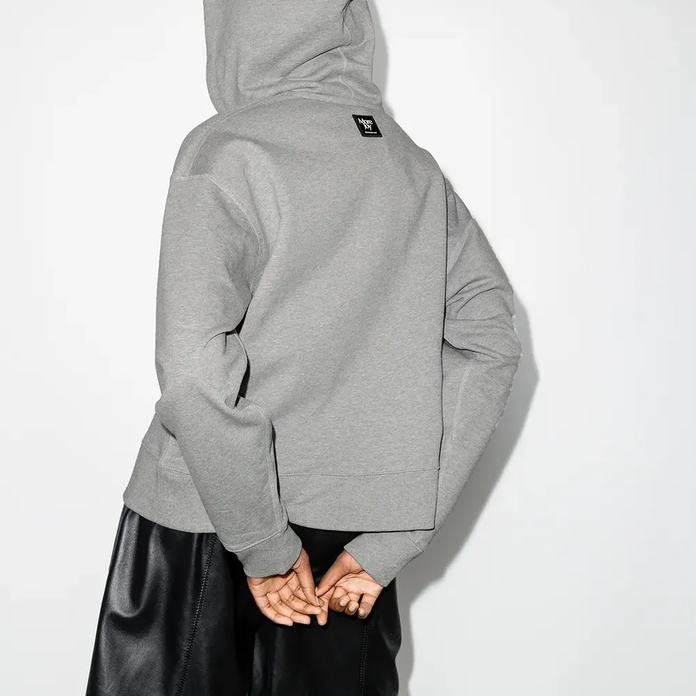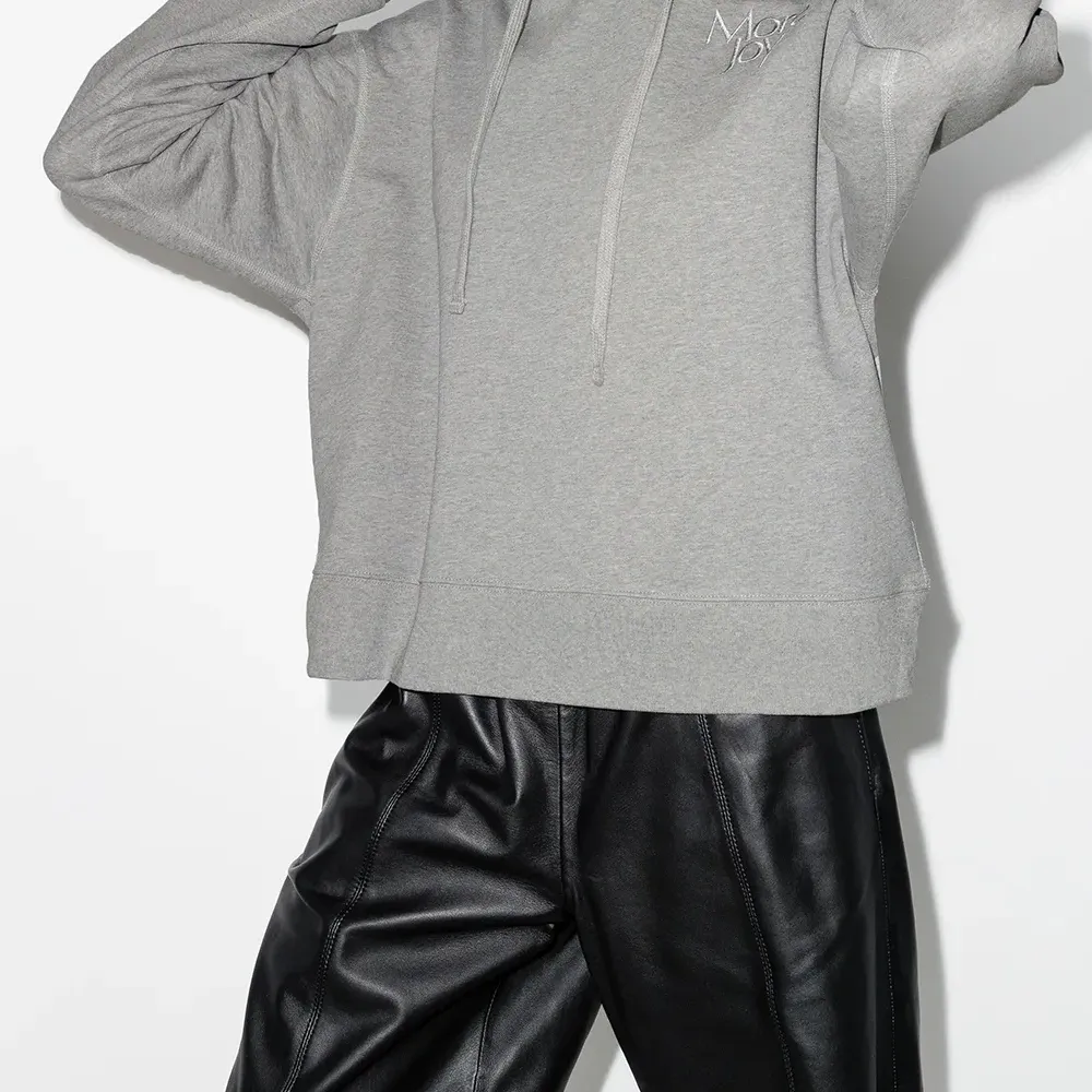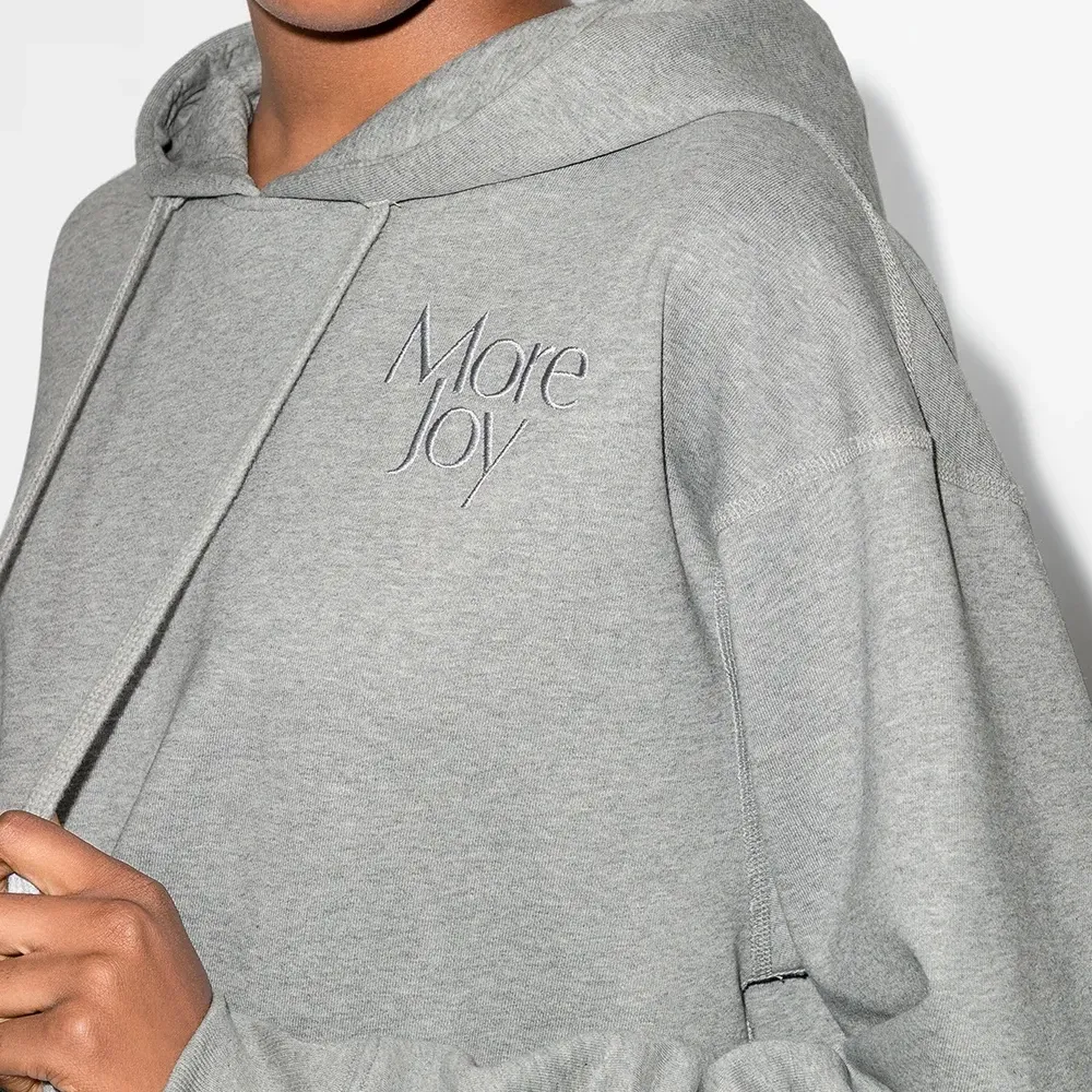 Укороченная длина, эффект меланж, вышитый логотип на груди, затягивающийся на шнурок капюшон, длинные рукава, приспущенные плечи и прямой подол. Цвет: серый.