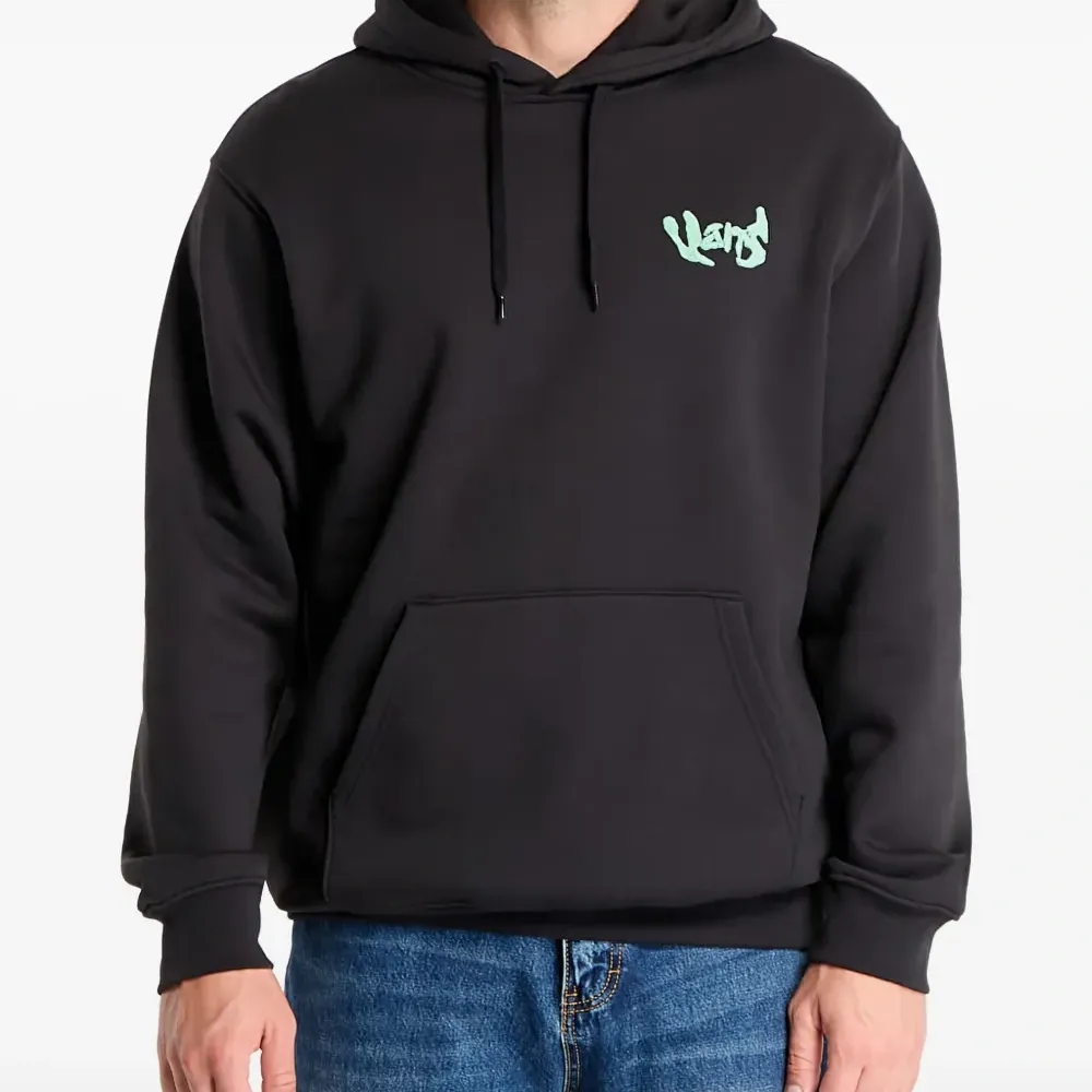 черный худи со шнурком, карманом-кенгуру спереди, длинными рукавами, ребристыми манжетами и ребристым поясом