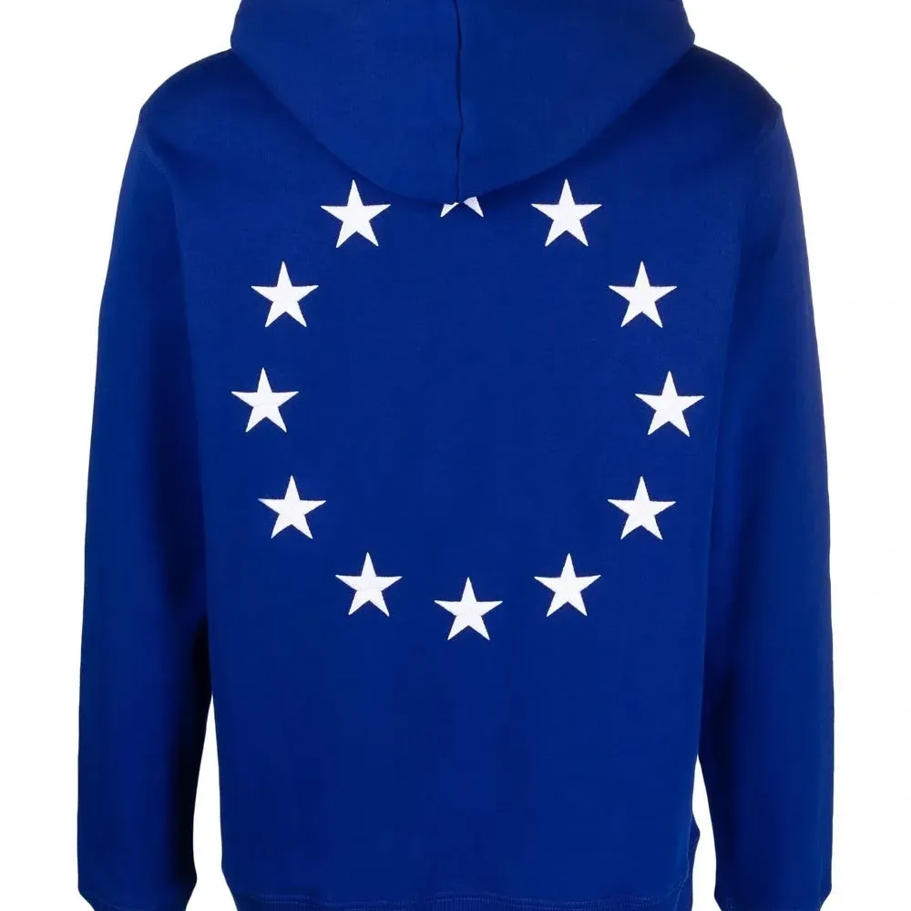 Кобальтово-синий, белый, органический хлопок, принт с изображением звезд, затягивающийся на шнурок капюшон, карман-муфта, длинные рукава и прямой подол. Ответственный выбор: