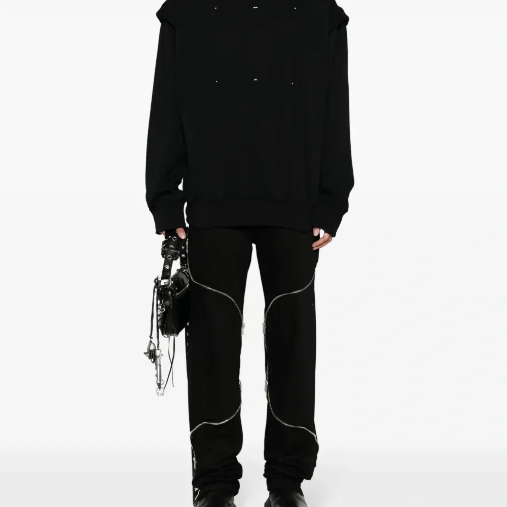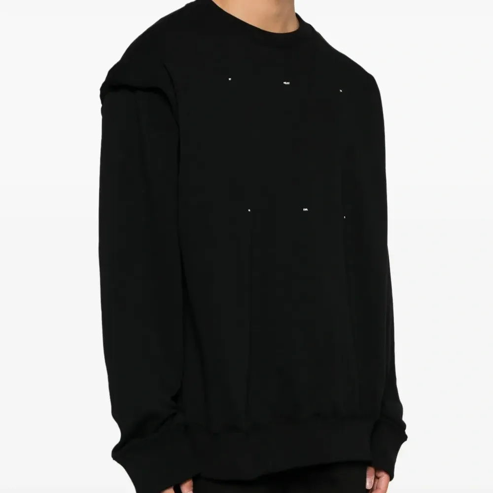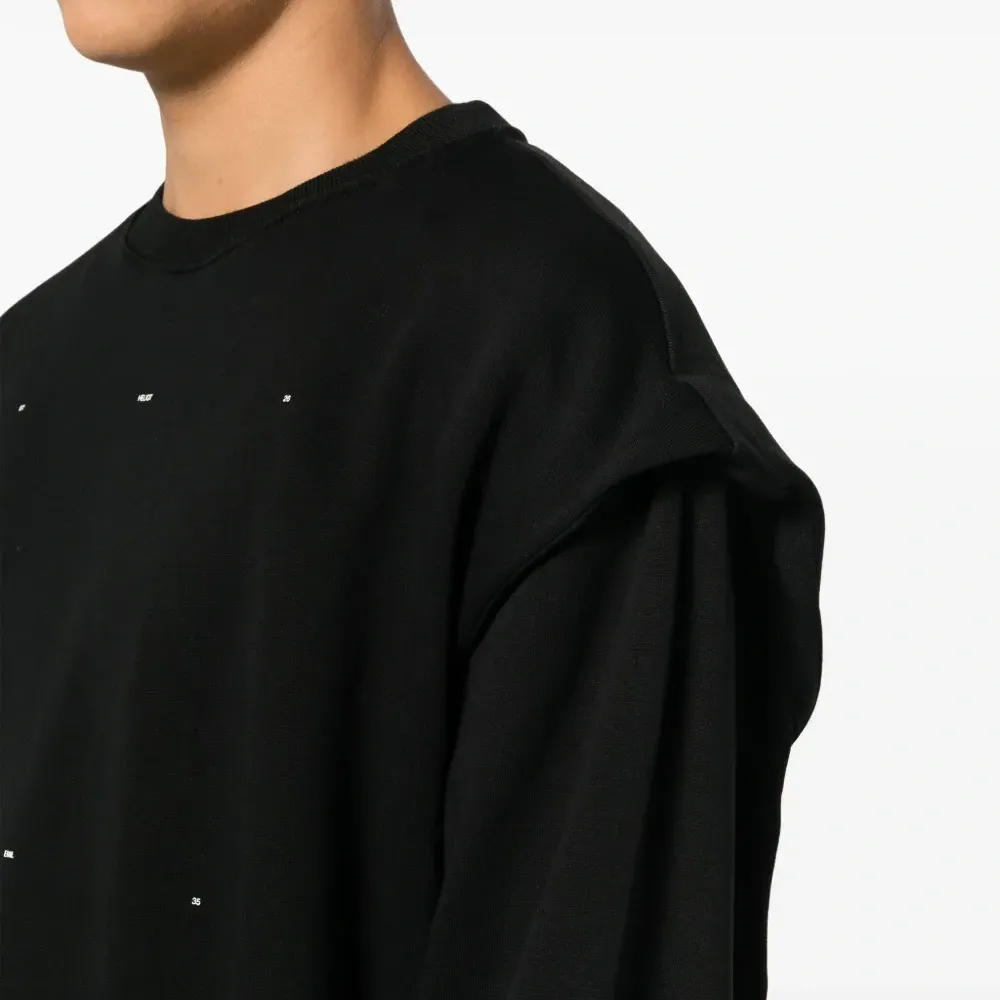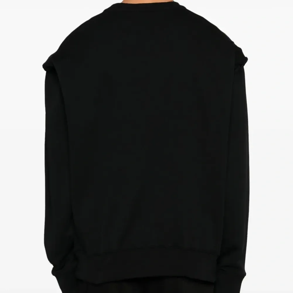 Черный, хлопок, многослойная деталь, круглый вырез, приспущенные плечи, длинные рукава, прямой подол и отделка в рубчик.