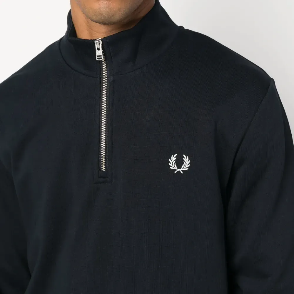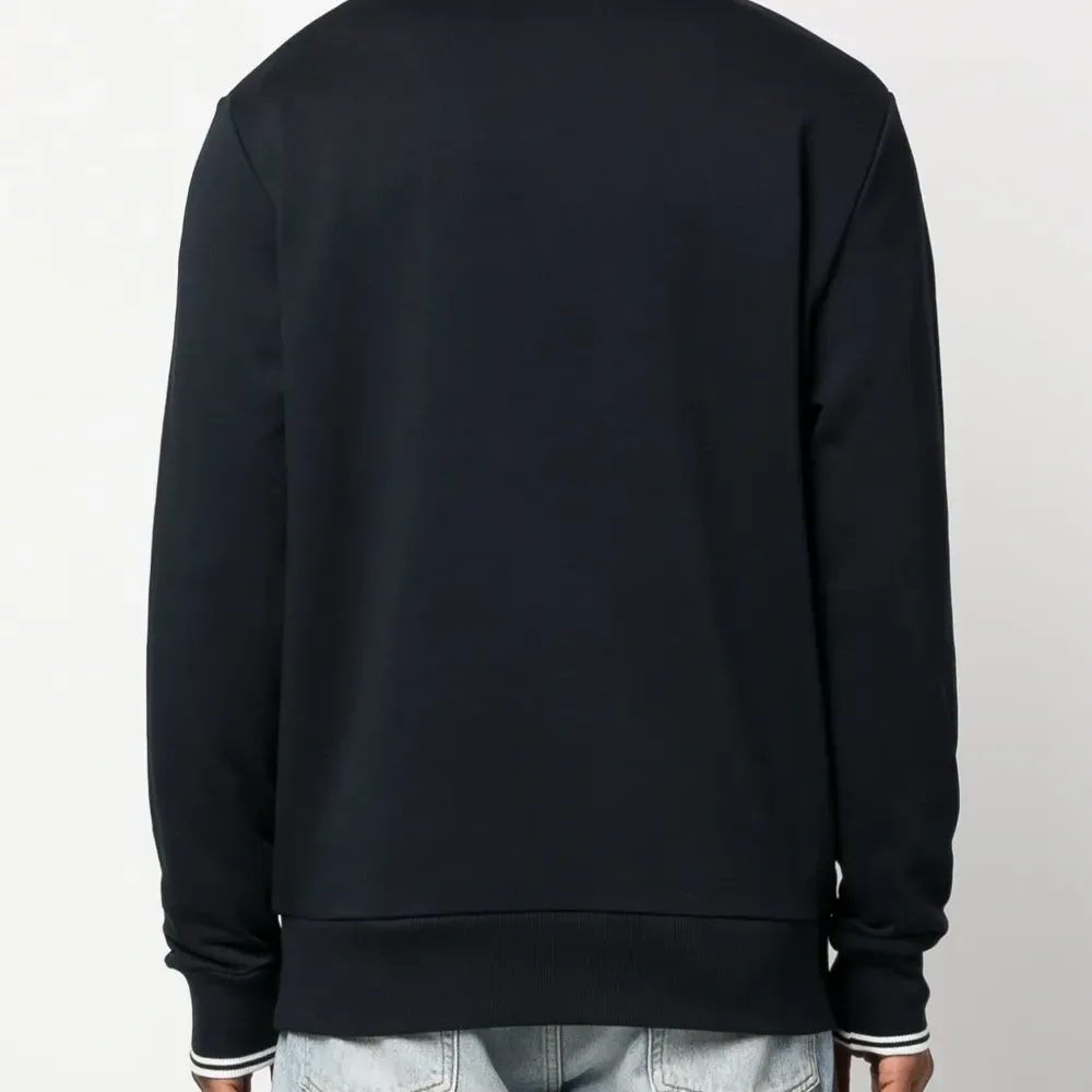 Синий, хлопок, вышитый логотип, края в полоску, высокий воротник, застежка на молнии спереди и длинные рукава.