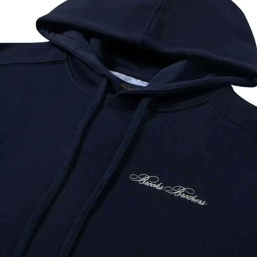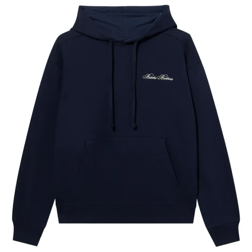 темно-синее худи с вышитым логотипом, кулиской на капюшоне, длинными рукавами и карманом-кенгуру спереди