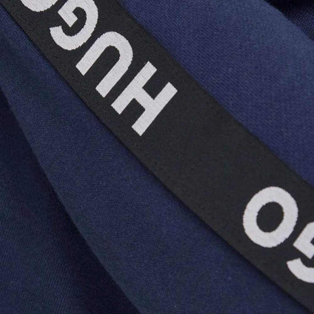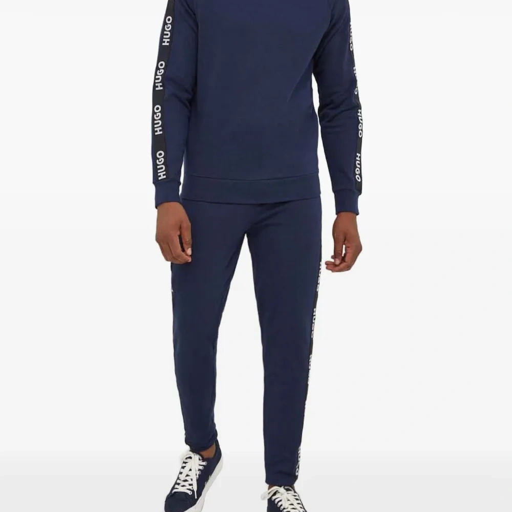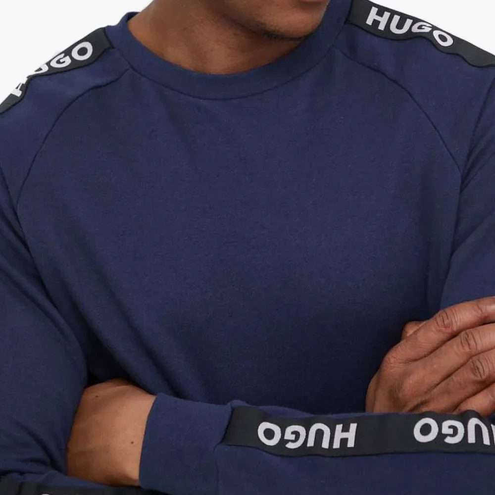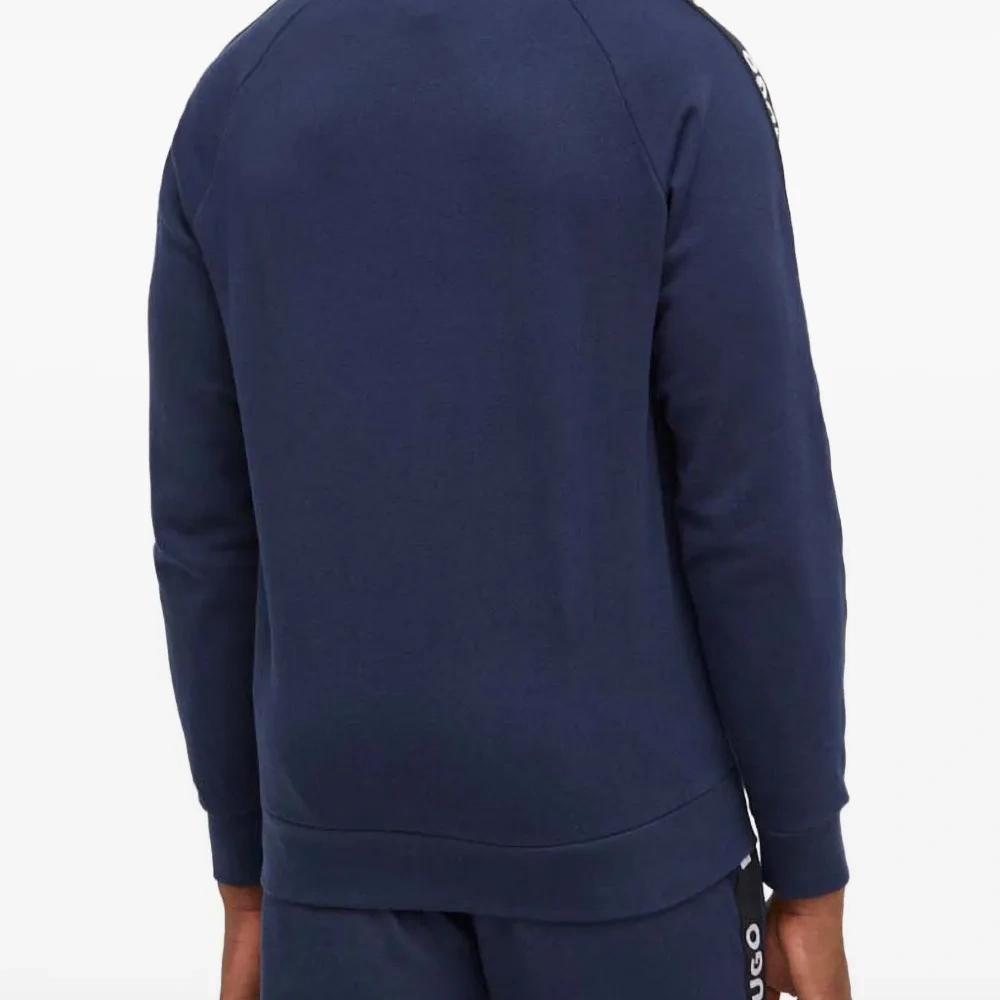 синий свитшот с логотипом, отделкой в виде ленты, круглым вырезом, длинными рукавами и ребристыми краями