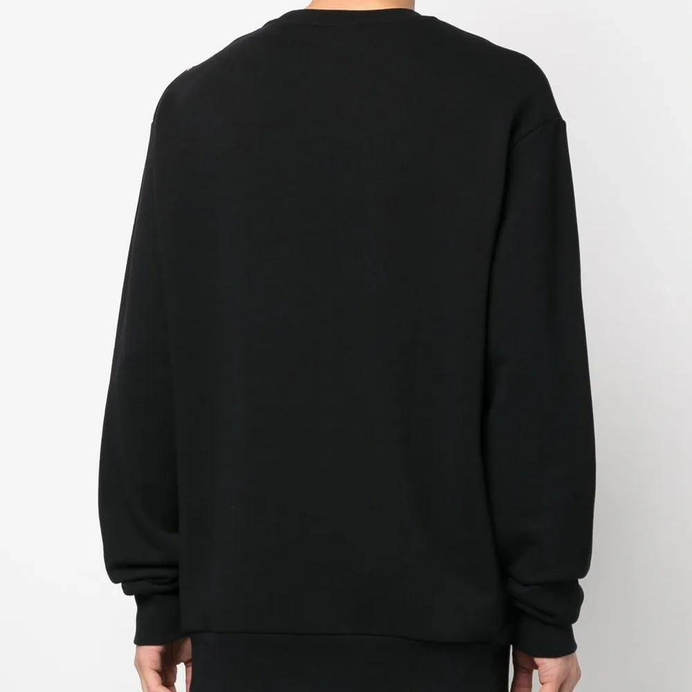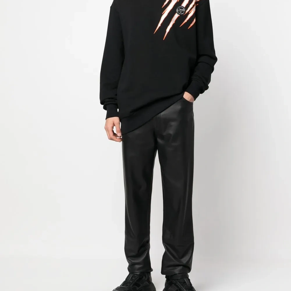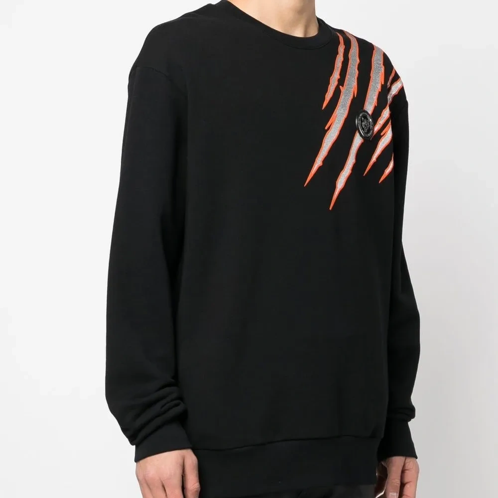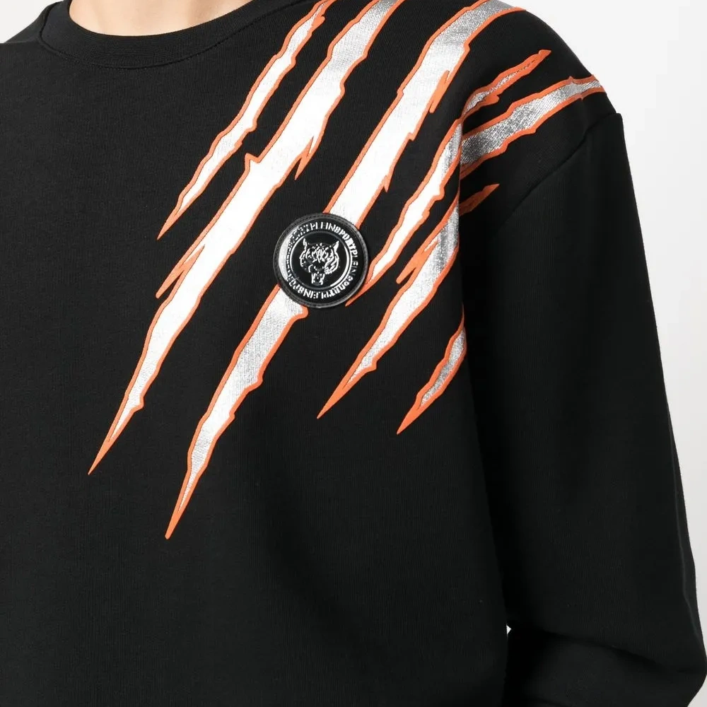 Эффект металлик, металлический логотип, круглый вырез, длинные рукава и прямой подол.