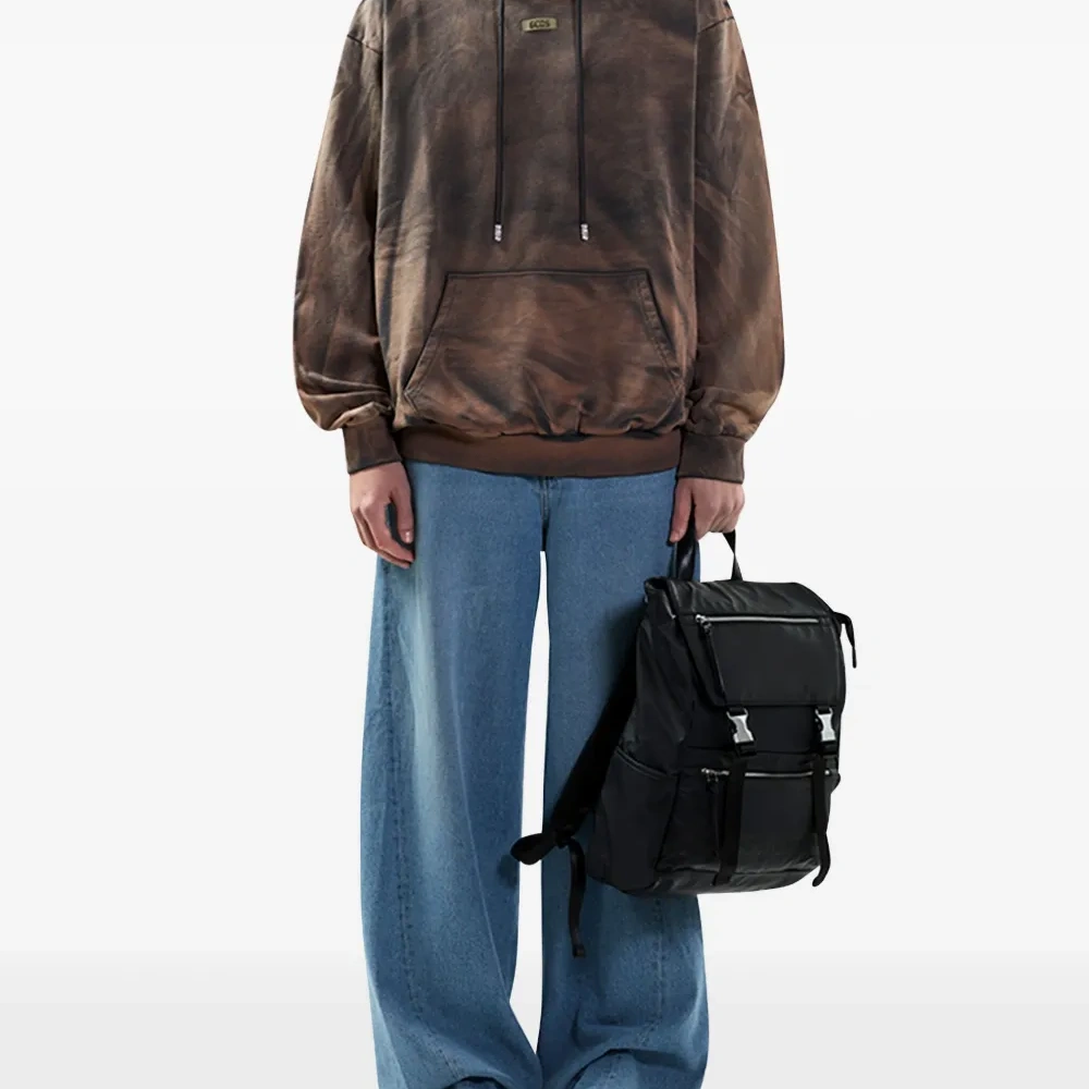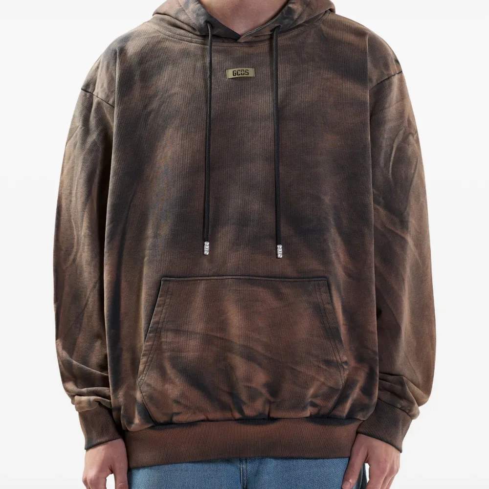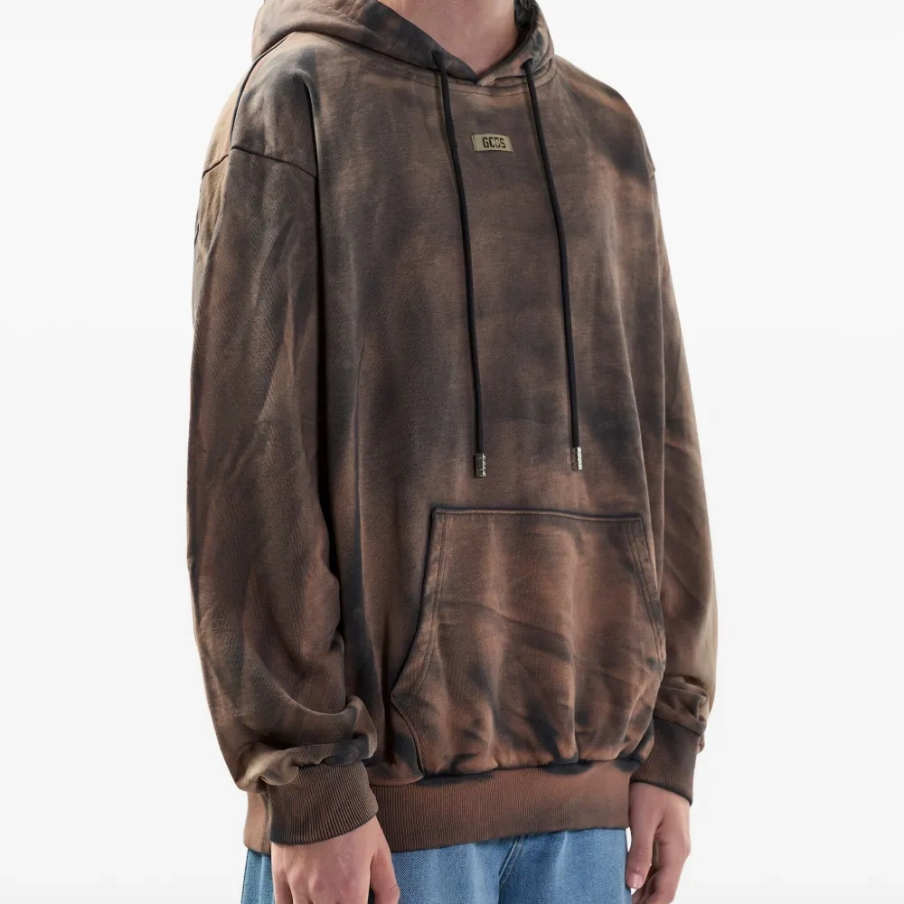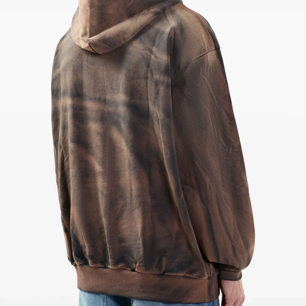коричневый свитшот с узором тай-дай, капюшоном на шнурке, нашивкой с логотипом, накладным карманом, длинными рукавами, ребристыми манжетами и нижним краем
