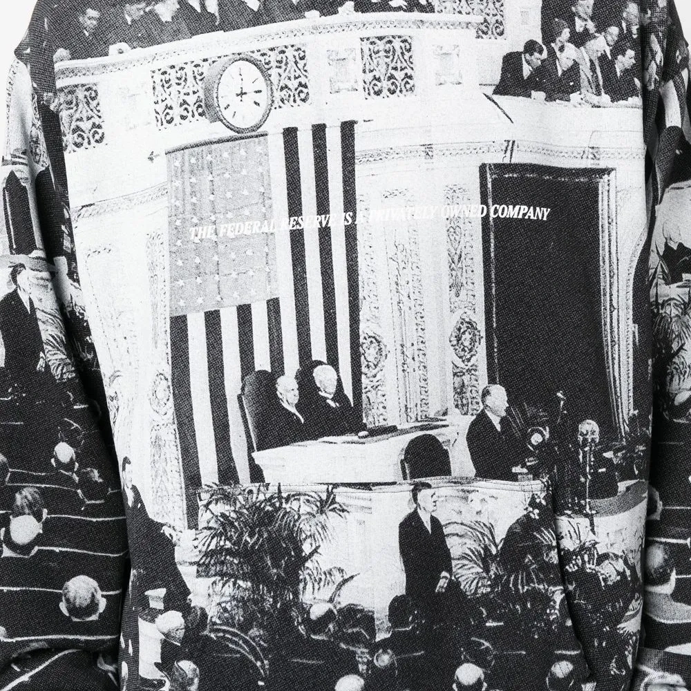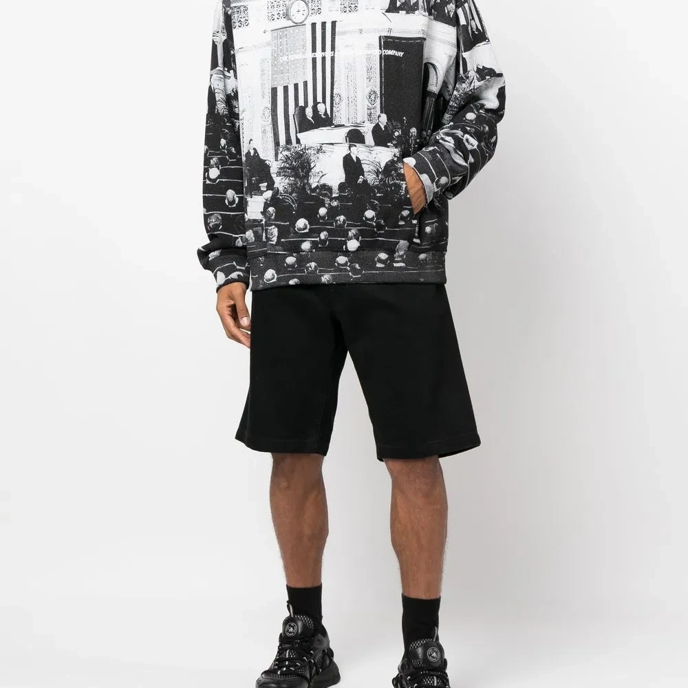 Черный/белый, хлопок, сплошной графичный принт, классический капюшон, длинные рукава, подол в рубчик и прямой подол.