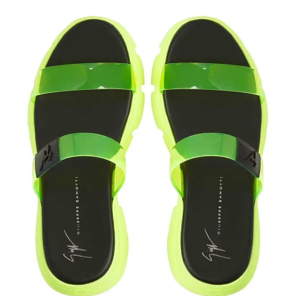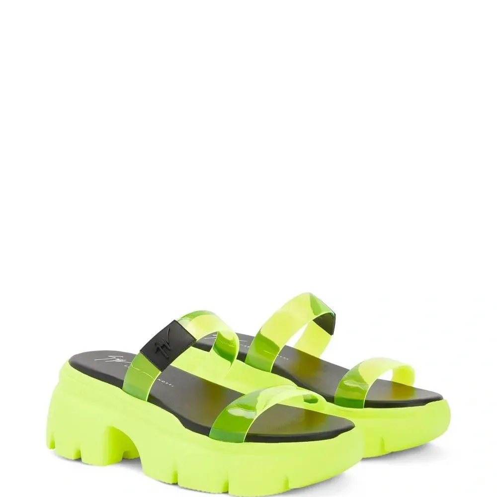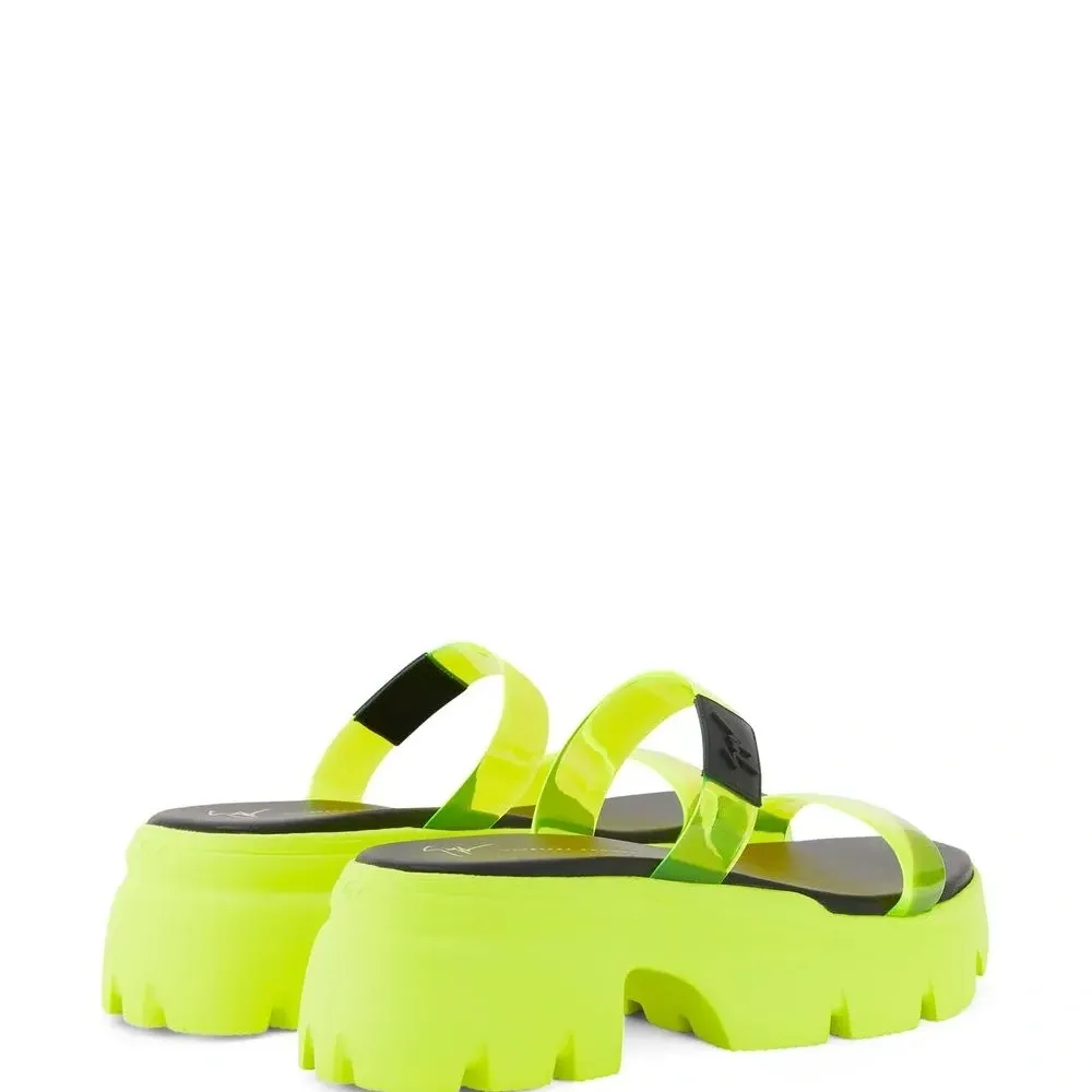 Флуоресцентный желтый, нашивка с логотипом спереди, прозрачный ремешок, закругленный носок, стелька с логотипом и рифленая резиновая подошва.