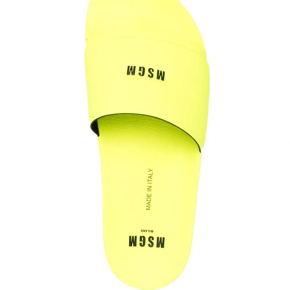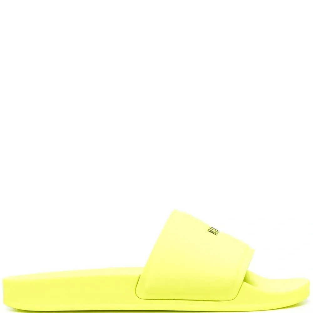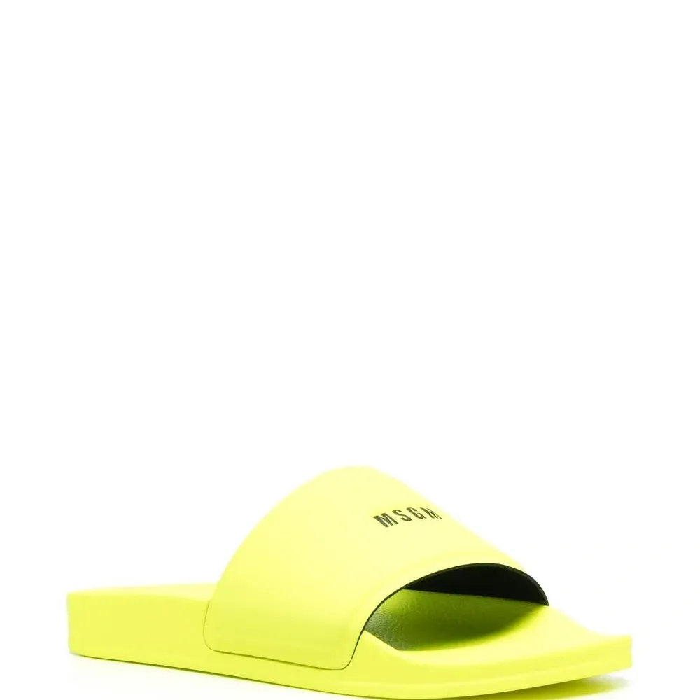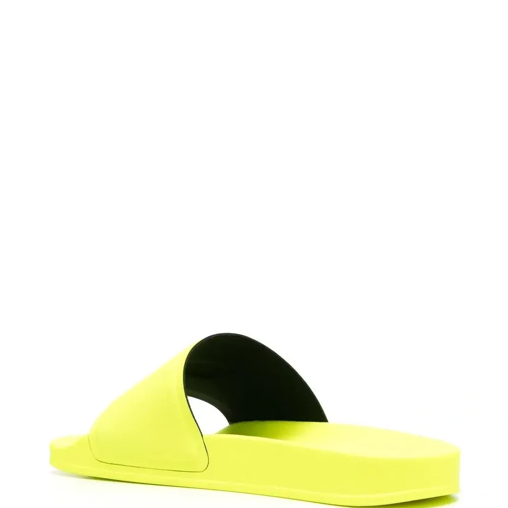 Флуоресцентный желтый, логотип спереди, открытый носок и плоская подошва.