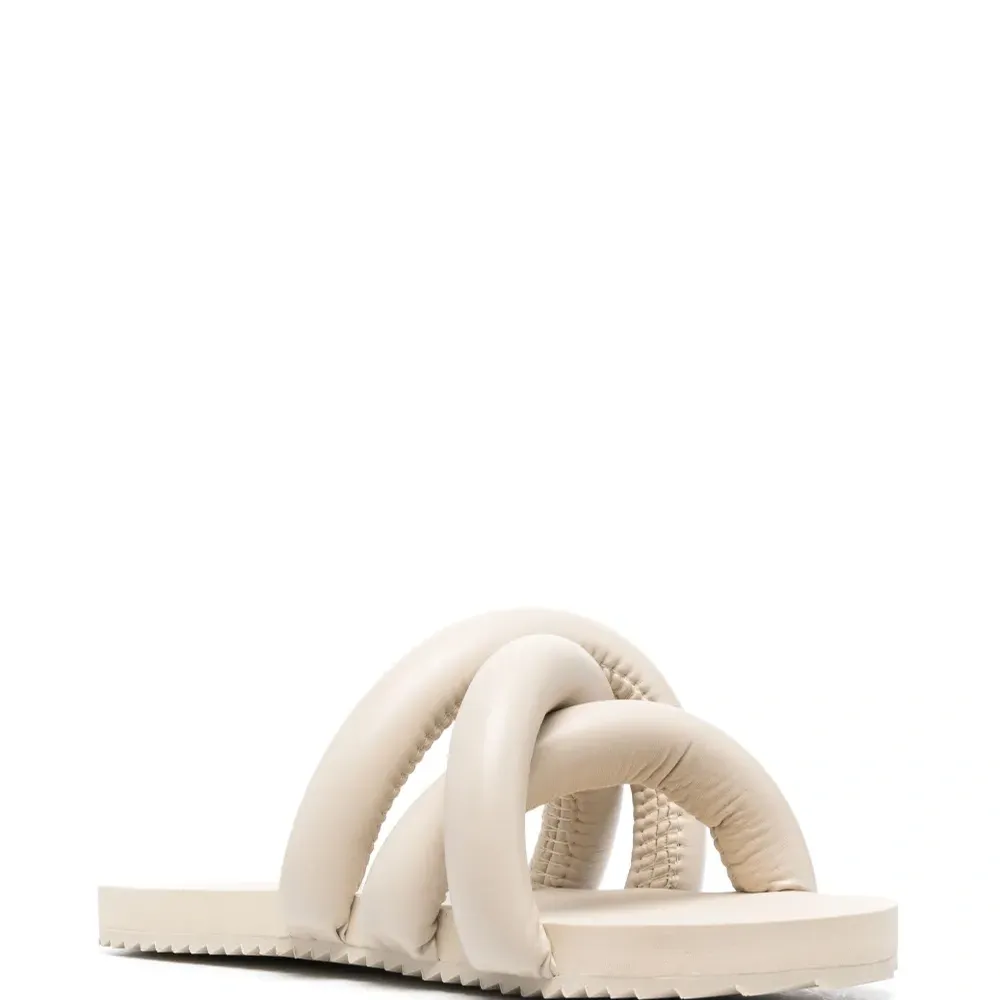 Бежевый, перекрестные ремешки, модель без застежки, открытый носок, стелька с логотипом и плоская резиновая подошва.