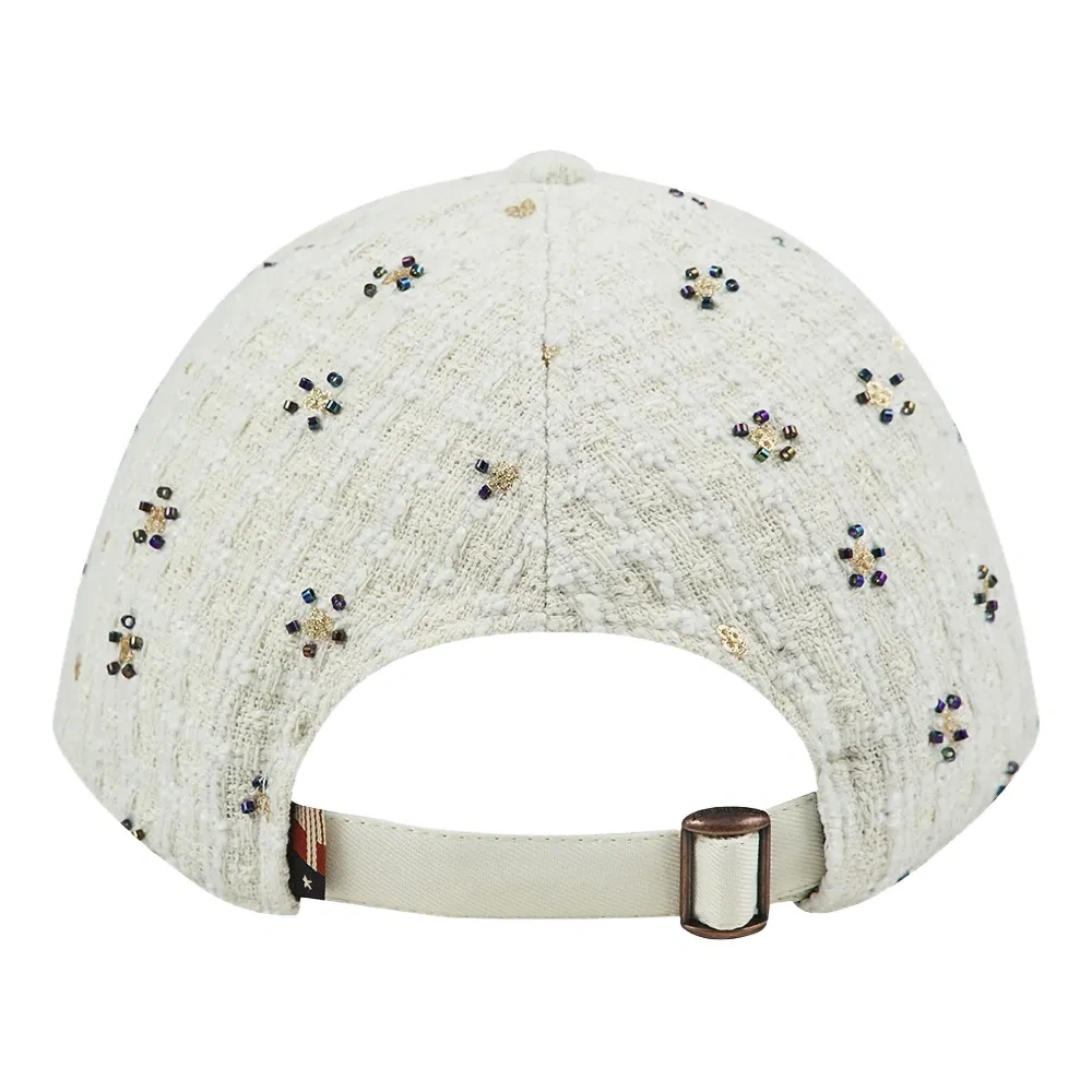 светло-бежевый твид, украшения из бисера, шестипанельный дизайн, регулируемый ремешок, вышитая нашивка с логотипом