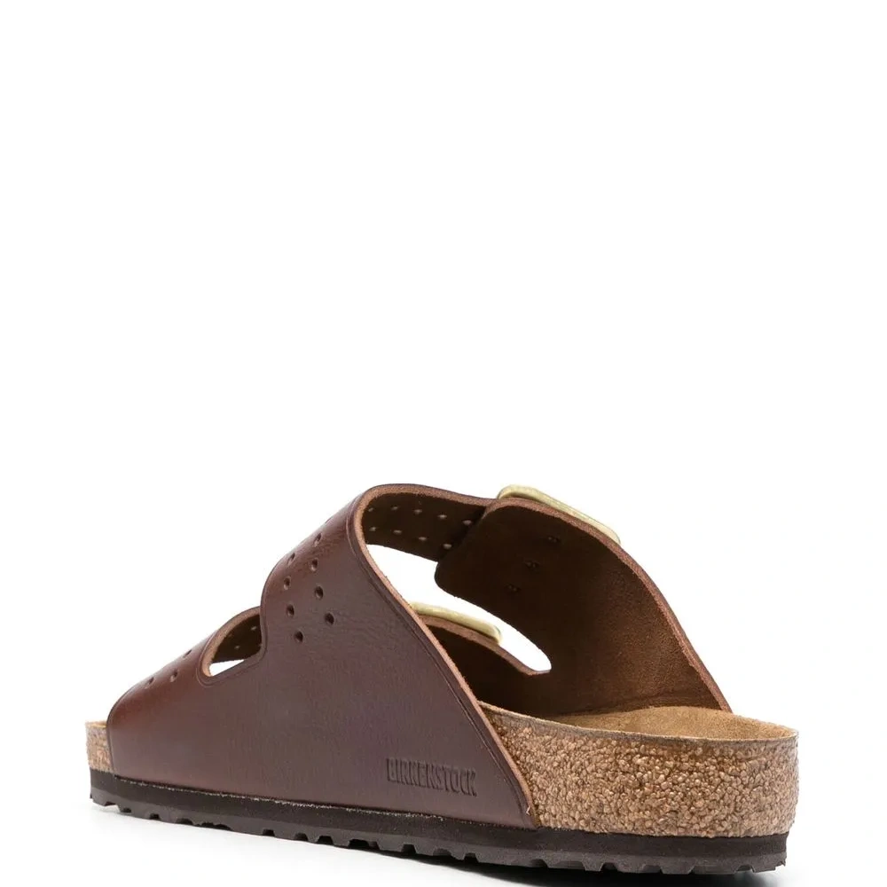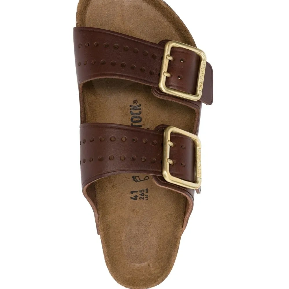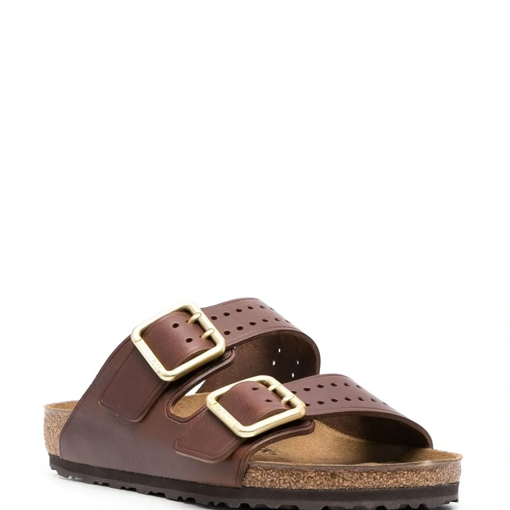 Красно-коричневый, телячья кожа, застежка с двумя пряжками, открытый носок, стелька с логотипом и плоская резиновая подошва.