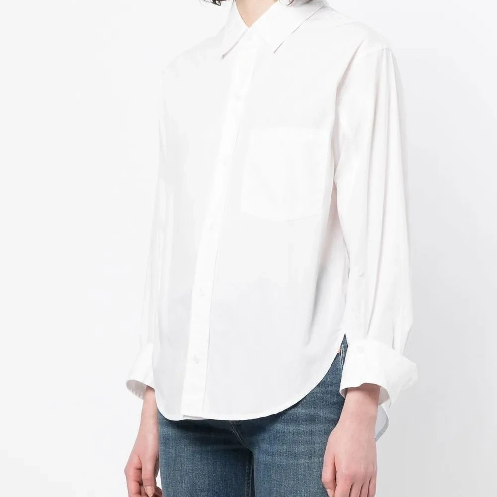 Серовато-белый, хлопок, классический воротник, застежка на пуговицах спереди, длинные рукава, манжеты на пуговицах и закругленный подол. . Узнать больше о том, какие товары получают отметку «Ответственный выбор», можно из материала «Как мы оцениваем экологичность и этичность».