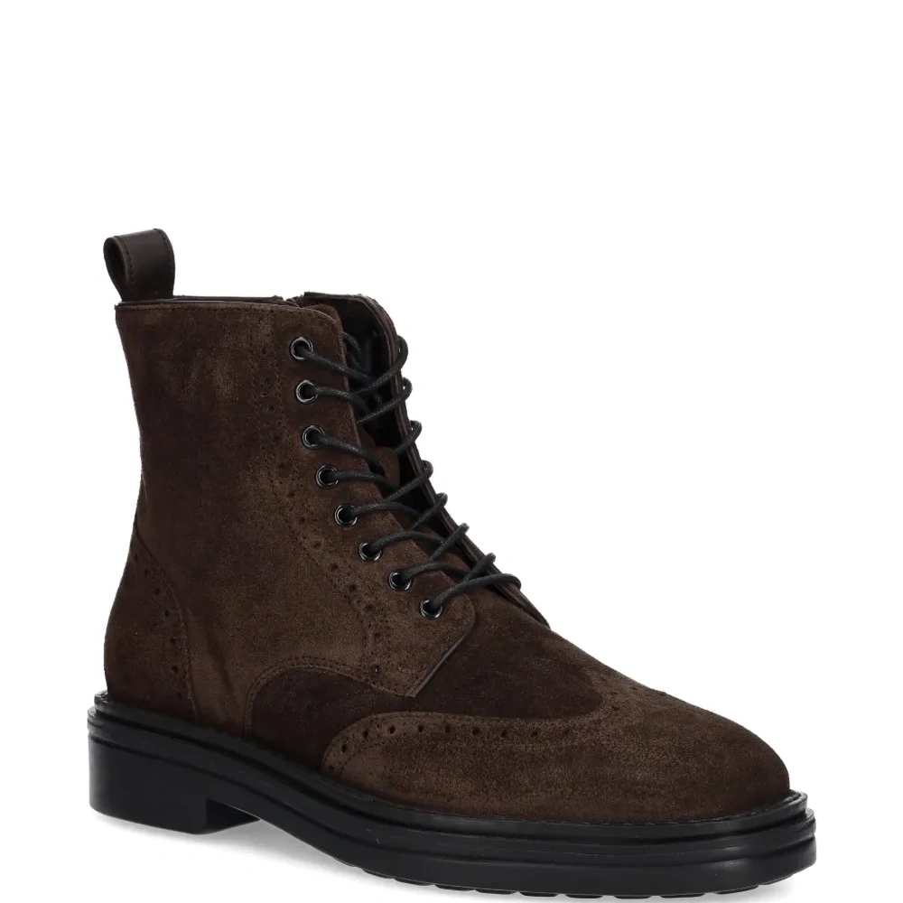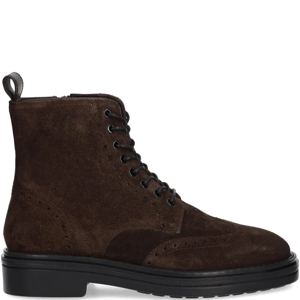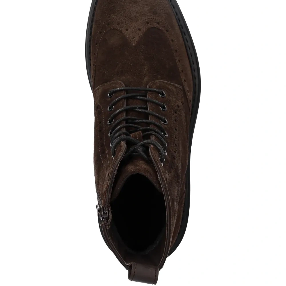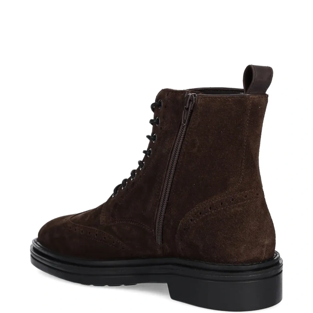 коричневая замша, шнуровка, застежка-молния сбоку, петелька сзади, отделка в стиле "броги" (wingtip)