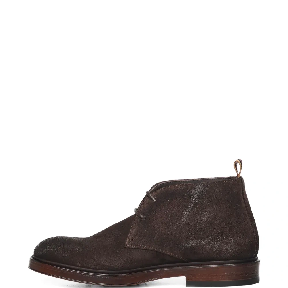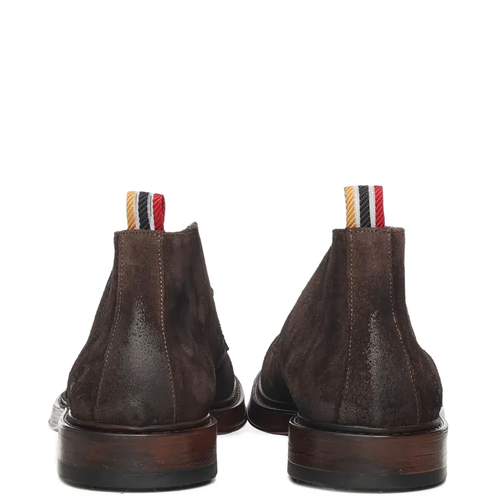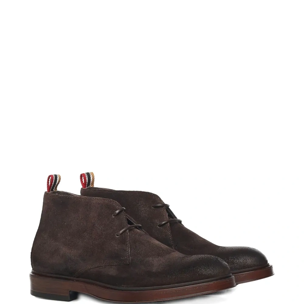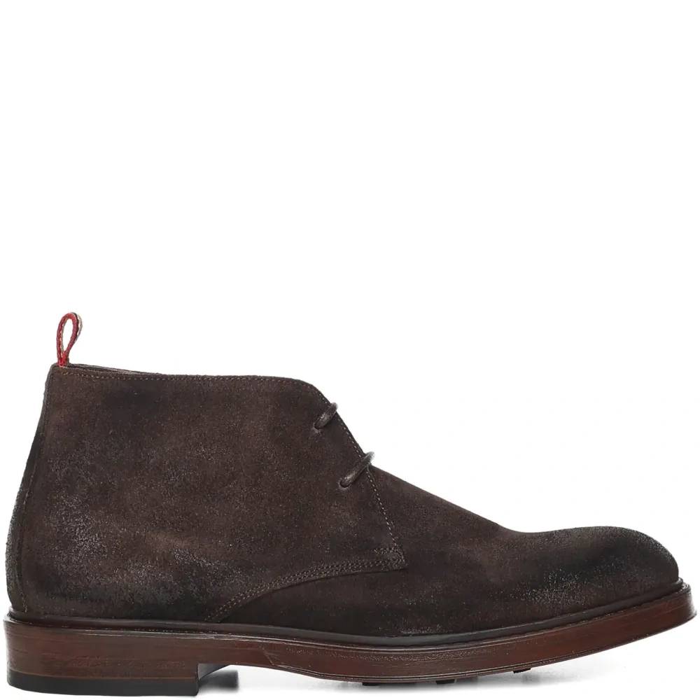 темно-коричневый замшевый материал, шнуровка, резиновая подошва, полосатая петля для подтягивания