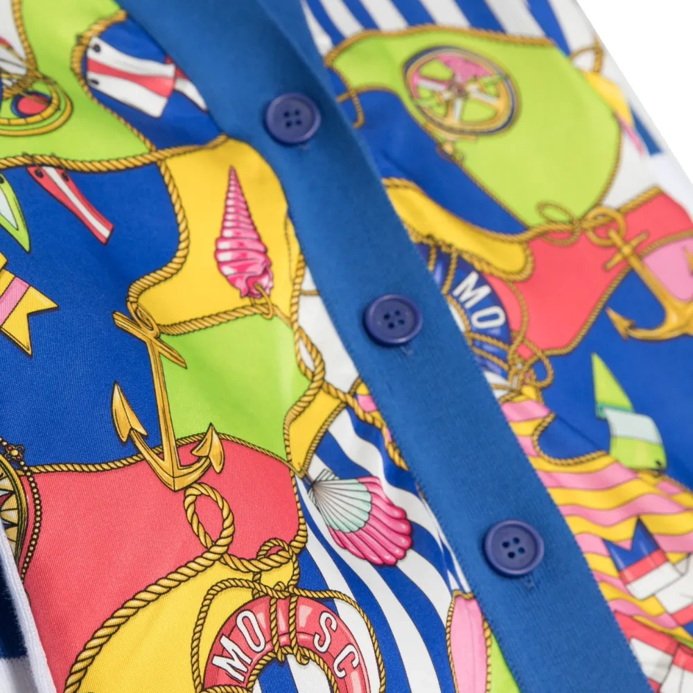 Кобальтово-синий, разноцветный, хлопок, графичный принт спереди, принт в горизонтальную полоску, контрастные вставки, V-образный вырез, планка на пуговицах спереди, длинные рукава и прямой подол.