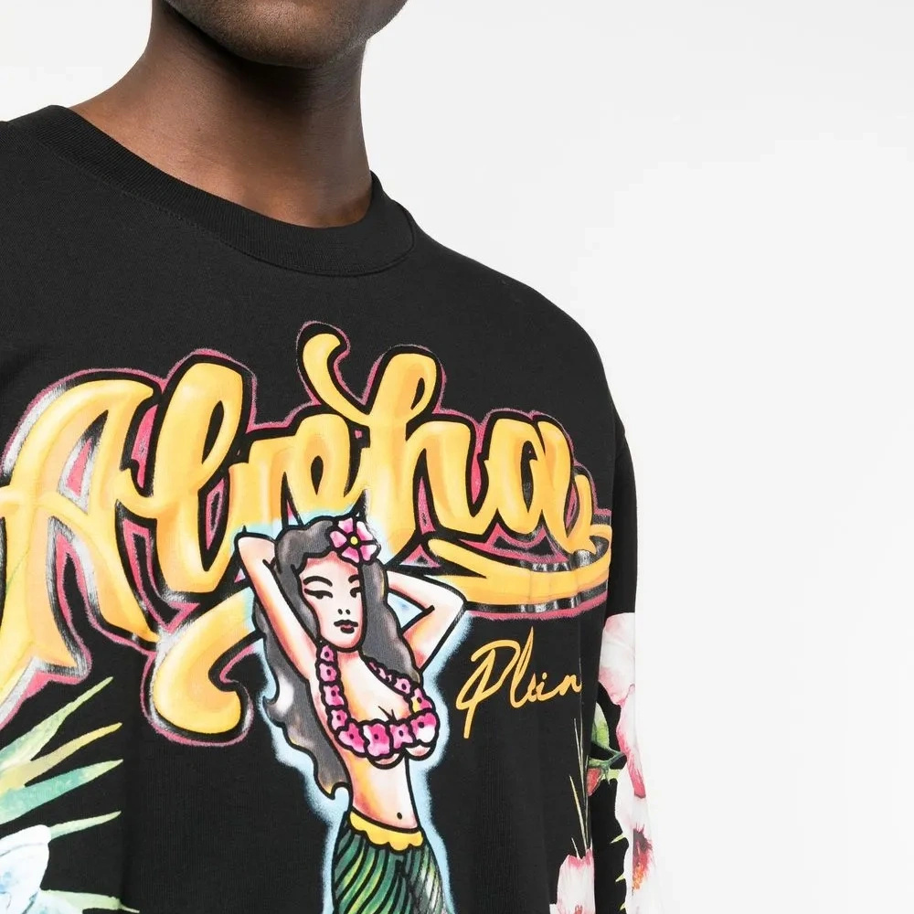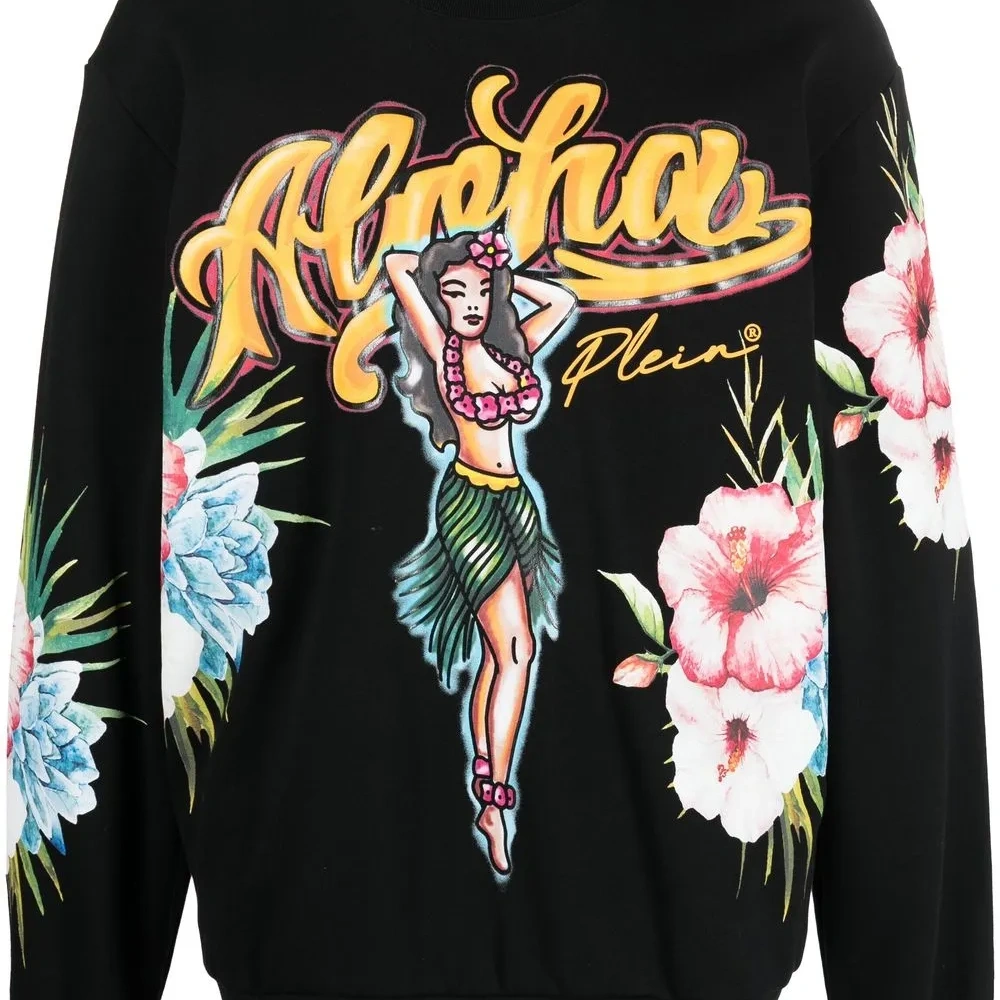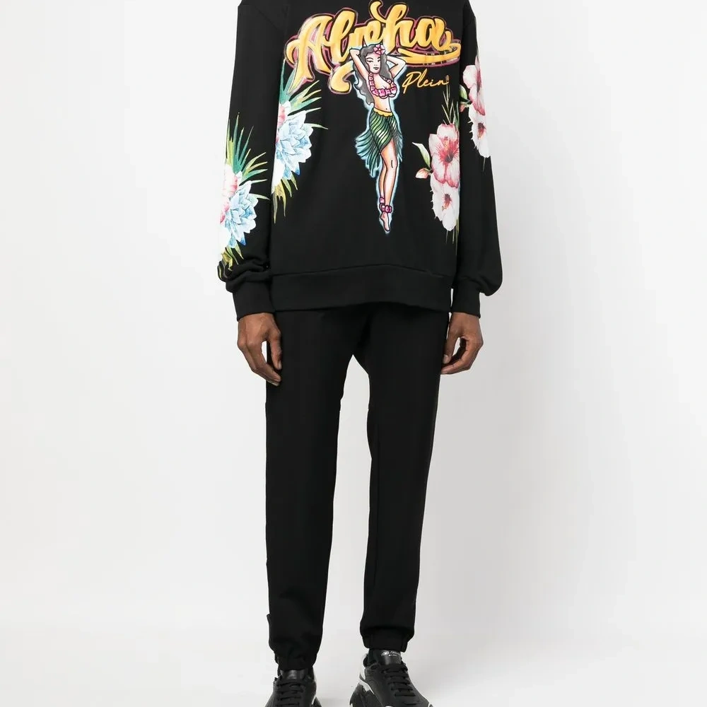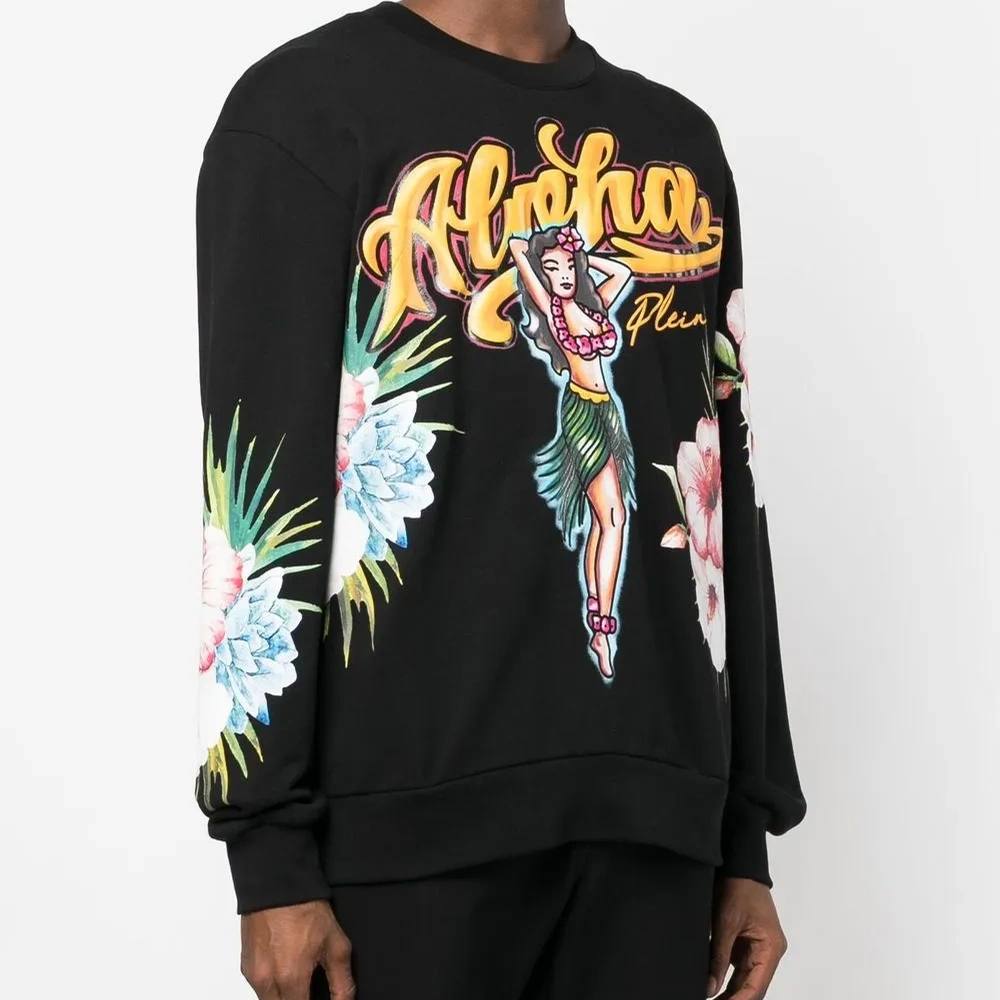Черный, хлопок, сплошной графичный принт, нашивка с логотипом сзади, круглый вырез, длинные рукава, эластичные манжеты и прямой подол.