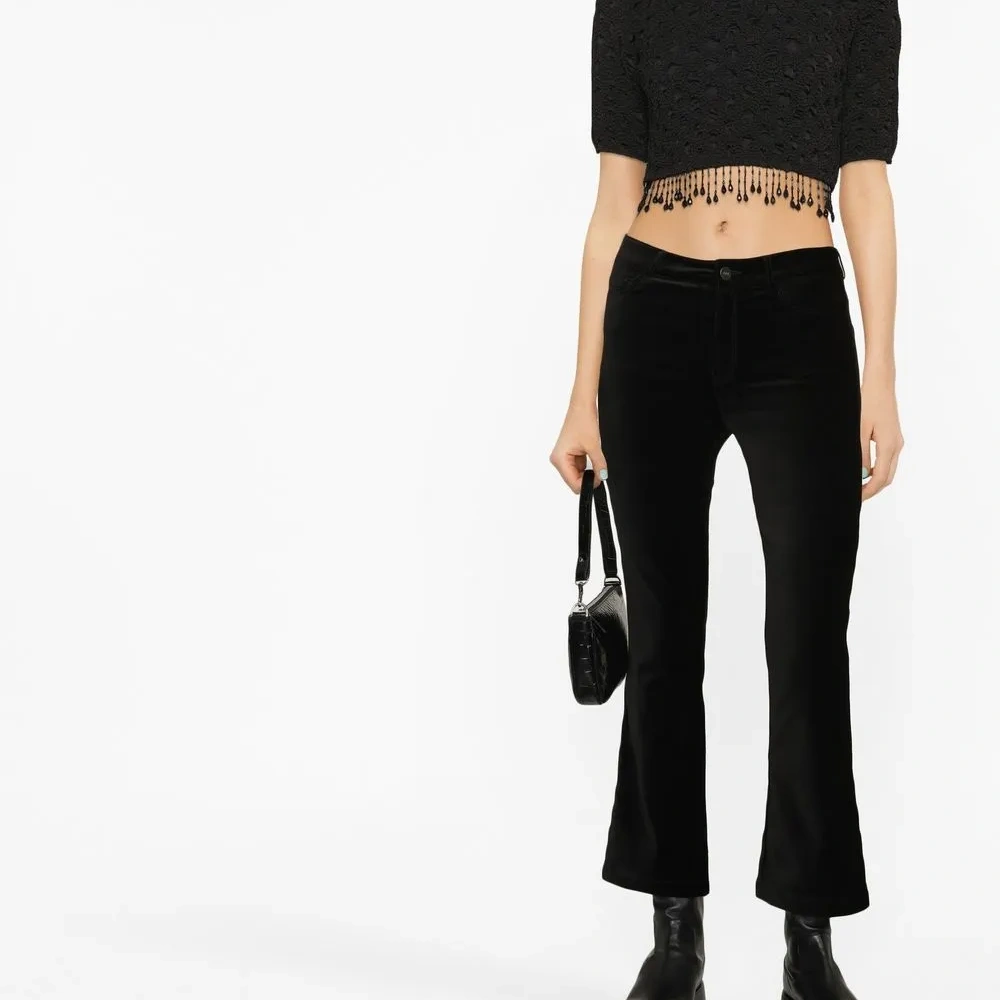 Темный оттенок денима, петли для ремня, застежка на молнии и пуговице спереди, пять карманов, узкий крой, расклешенный крой и укороченная длина.