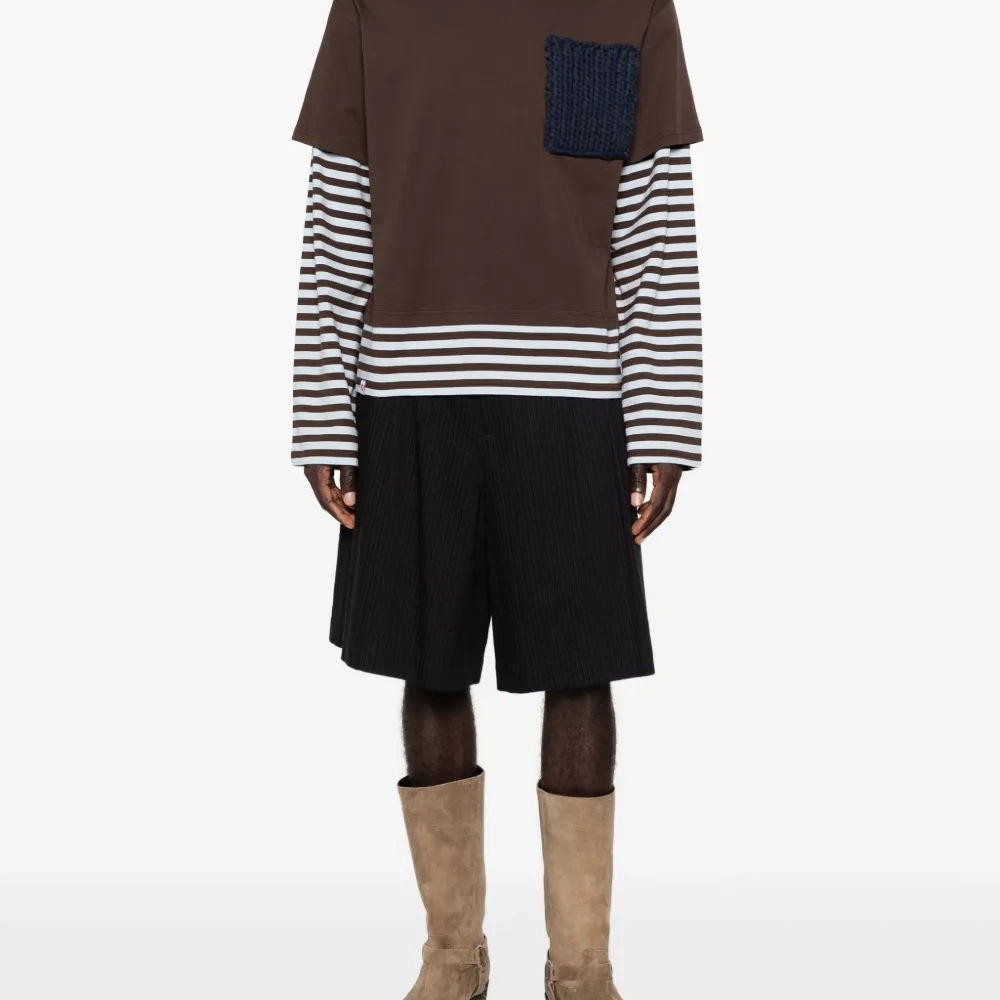 коричневый с полосатыми рукавами, накладным карманом, круглым вырезом и длинными рукавами