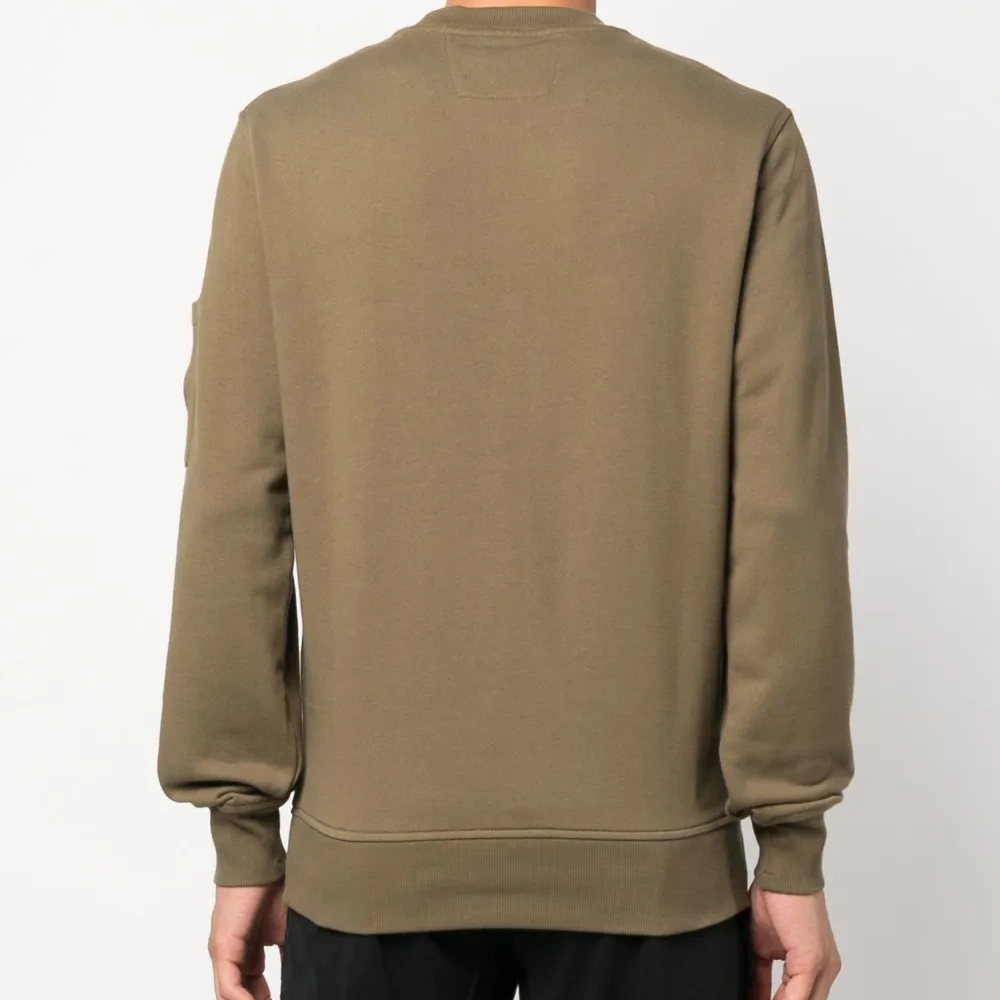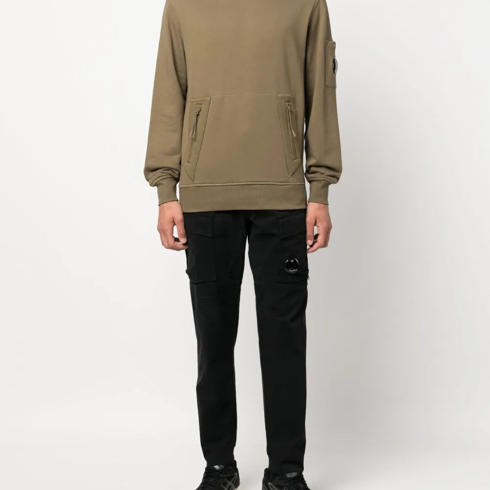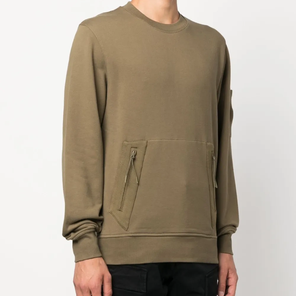 Серо-зеленый, хлопок, строчка в тон, декоративная линза, круглый вырез, длинные рукава, прямой подол, отделка в рубчик, два кармана на молнии по бокам и накладной карман на рукаве.