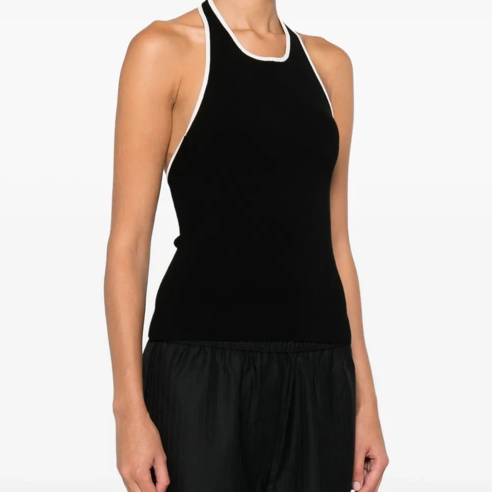 черный топ с воротником-хомутом, без рукавов, с прямым подолом