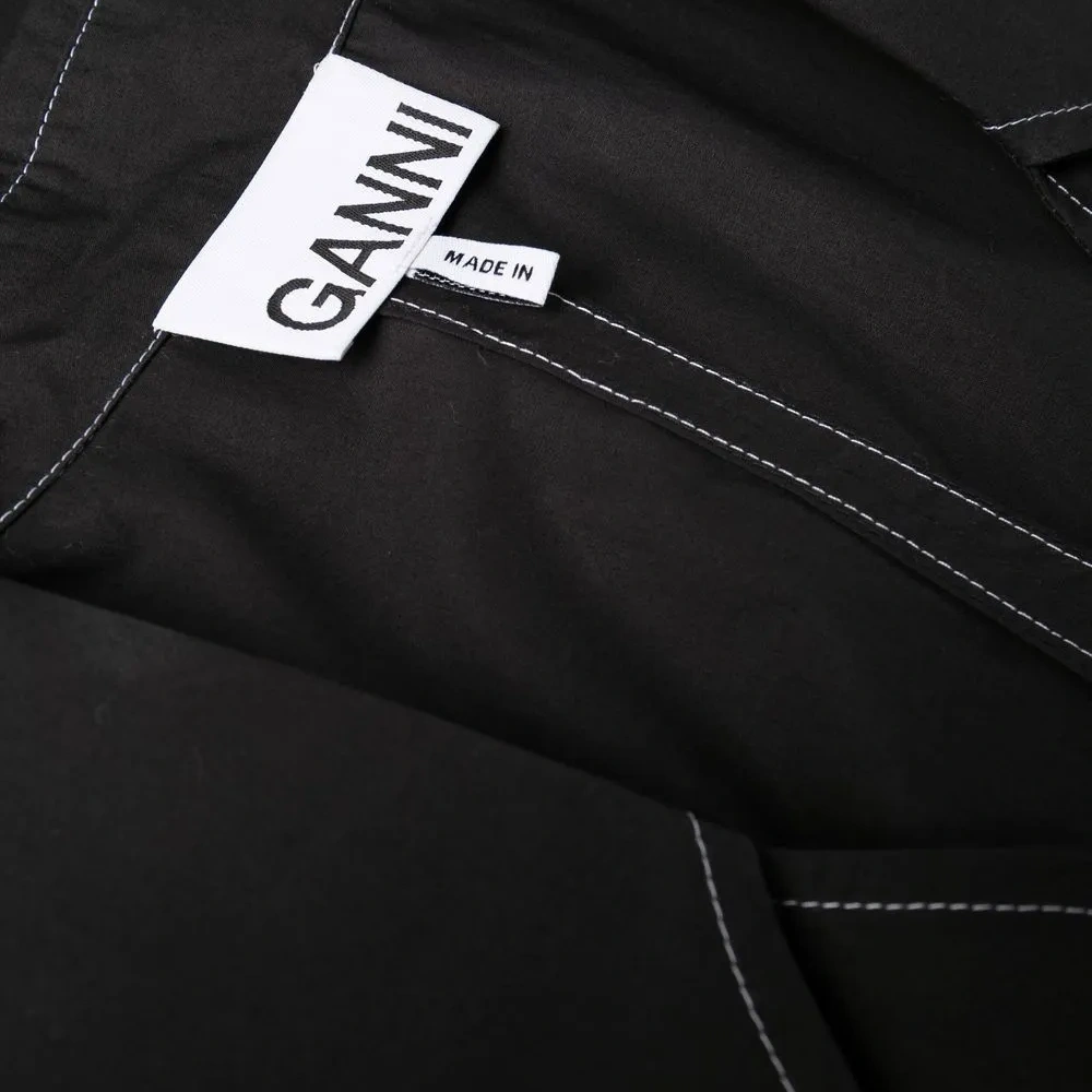 Черный/белый, органический хлопок, контрастная строчка, встречная складка, V-образный вырез, широкий заостренный воротник, короткие объемные рукава, А-образный силуэт, прямой подол и длина миди.