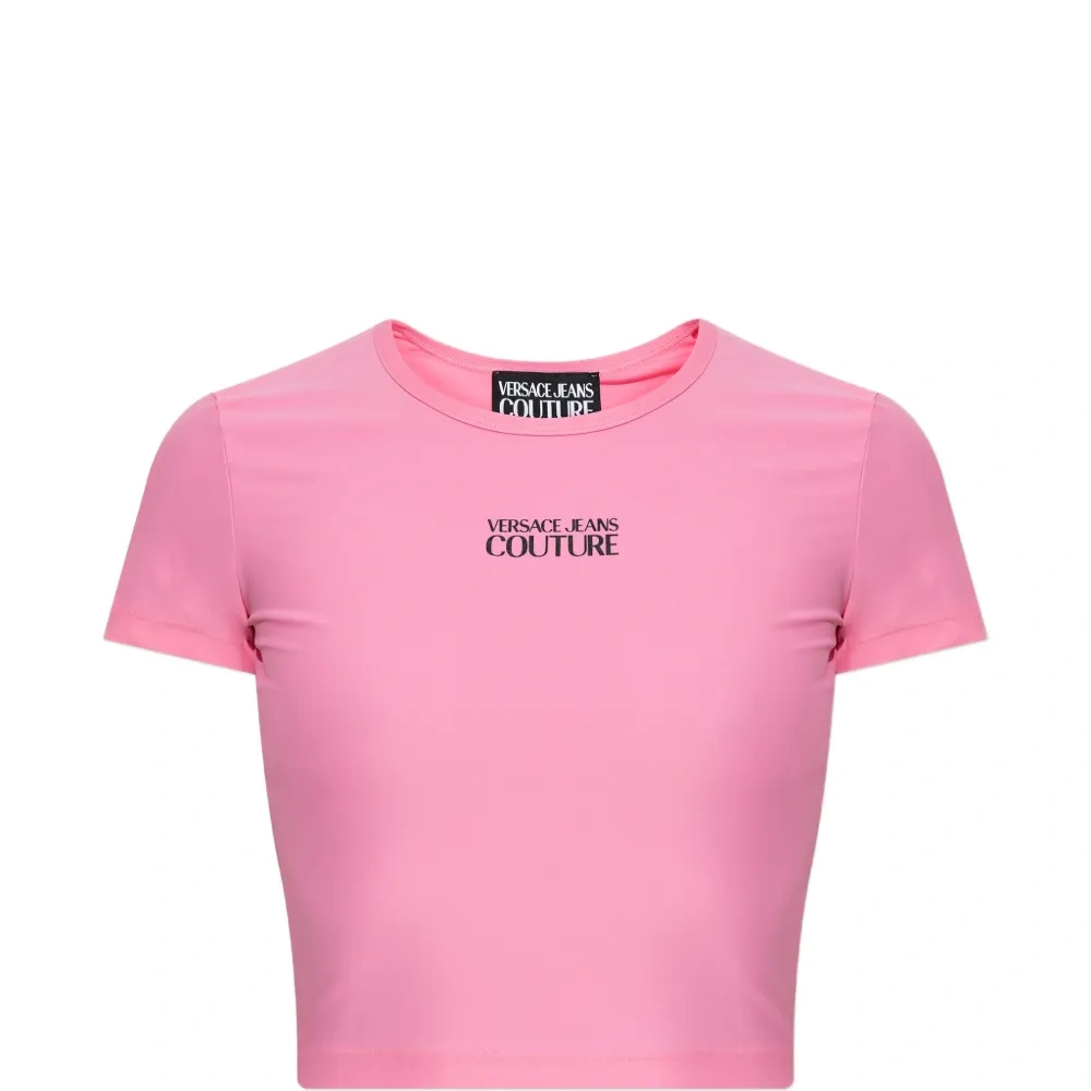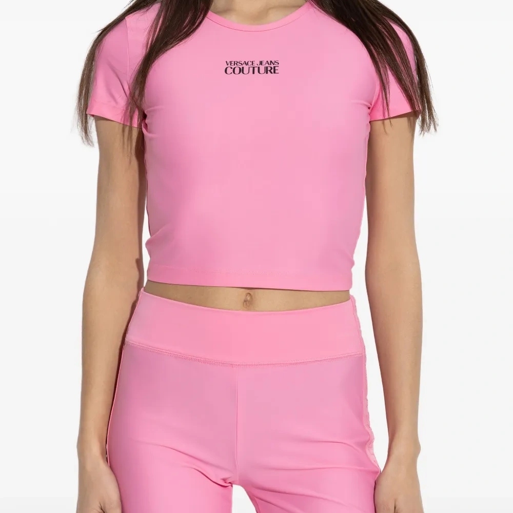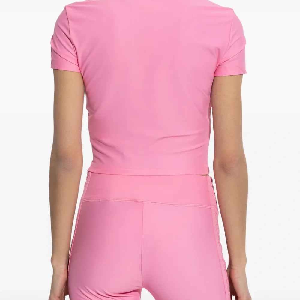 розовая укороченная футболка с круглым вырезом, короткими рукавами и логотипом