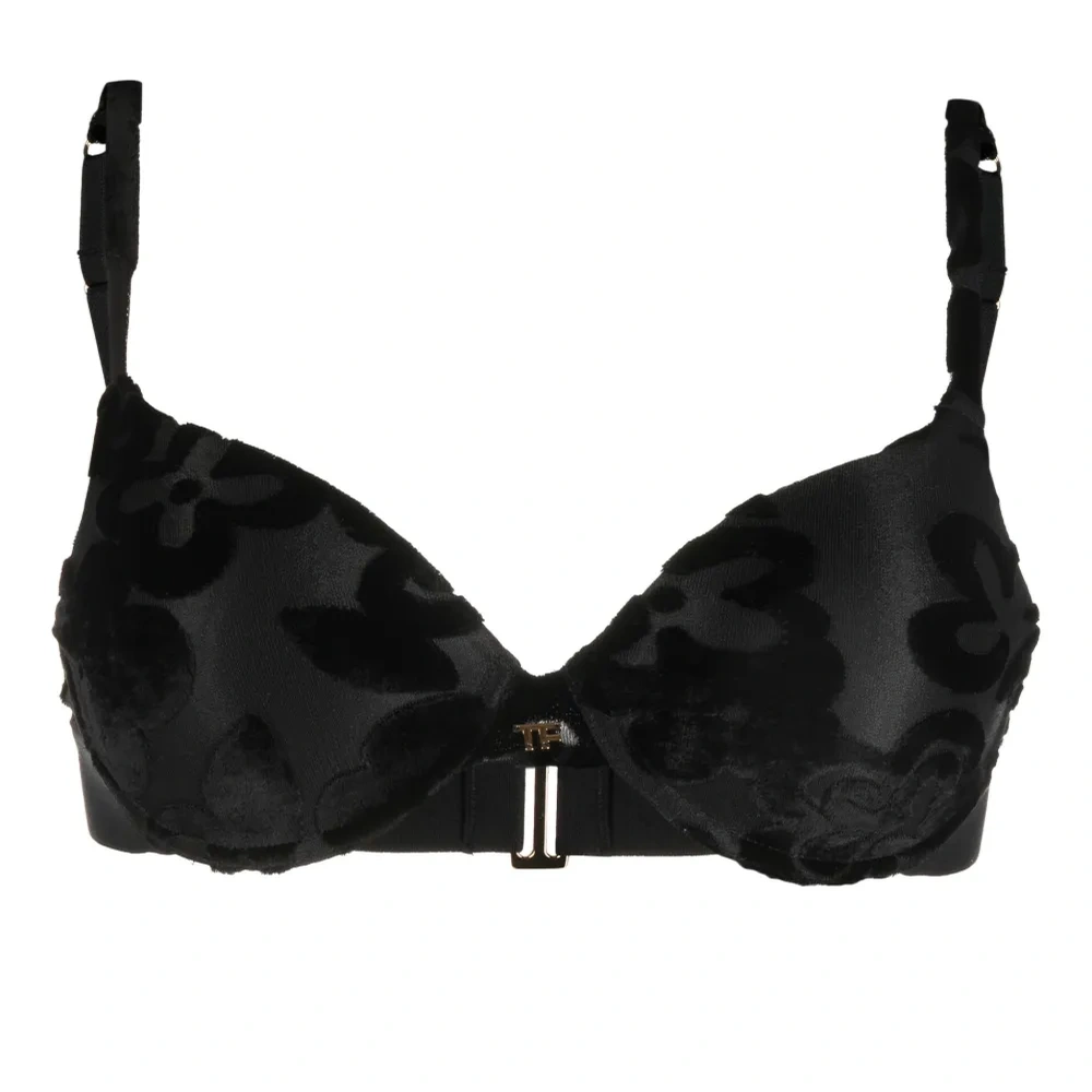 Черный, эластичный материал, сплошной цветочный принт, золотистый металлический логотип, формованная чашка, чашка на косточках, регулируемые лямки и застежка-бабочка.